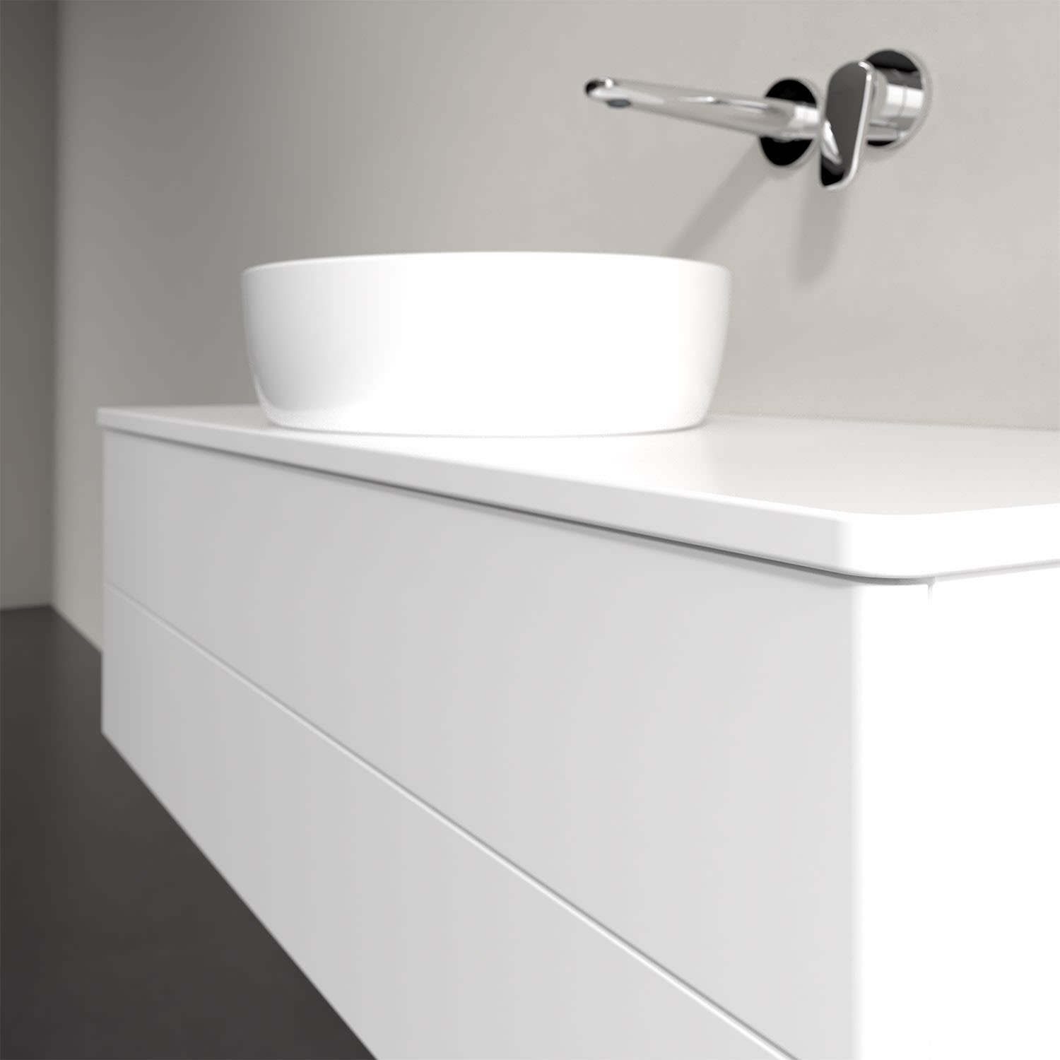 Der wandhängende Antao Waschtischunterschrank von Villeroy & Boch bietet nicht nur jede Menge Stauraum – er ist dank seines naturinspirierten Designs mit seinen abgerundeten Kanten auch noch besonders stilvoll und schafft eine gemütliche Atmosphäre im Badezimmer. Auf der Waschtischplatte bietet sich rechts und links neben dem Waschtisch viel Platz für Zahnbürstenbecher oder Seifenspender. Zwei geräumige Auszüge bieten viel Platz, um alles Notwendige zu verstauen und Ordnung zu halten. Öffnen lassen sie sich durch leichten Druck auf die grifflose Front. Dabei aktiviert sich übrigens die Auszugsbeleuchtung in angenehmem Warmweiß. Dank Vollauszug hat man immer alles im Blick und der Antirutschboden verhindert ein Umfallen oder Verrutschen der Gegenstände. Einfach clever! Für eine besonders leichte Pflege sorgt die mehrschichtig deckend lackierte Oberfläche.