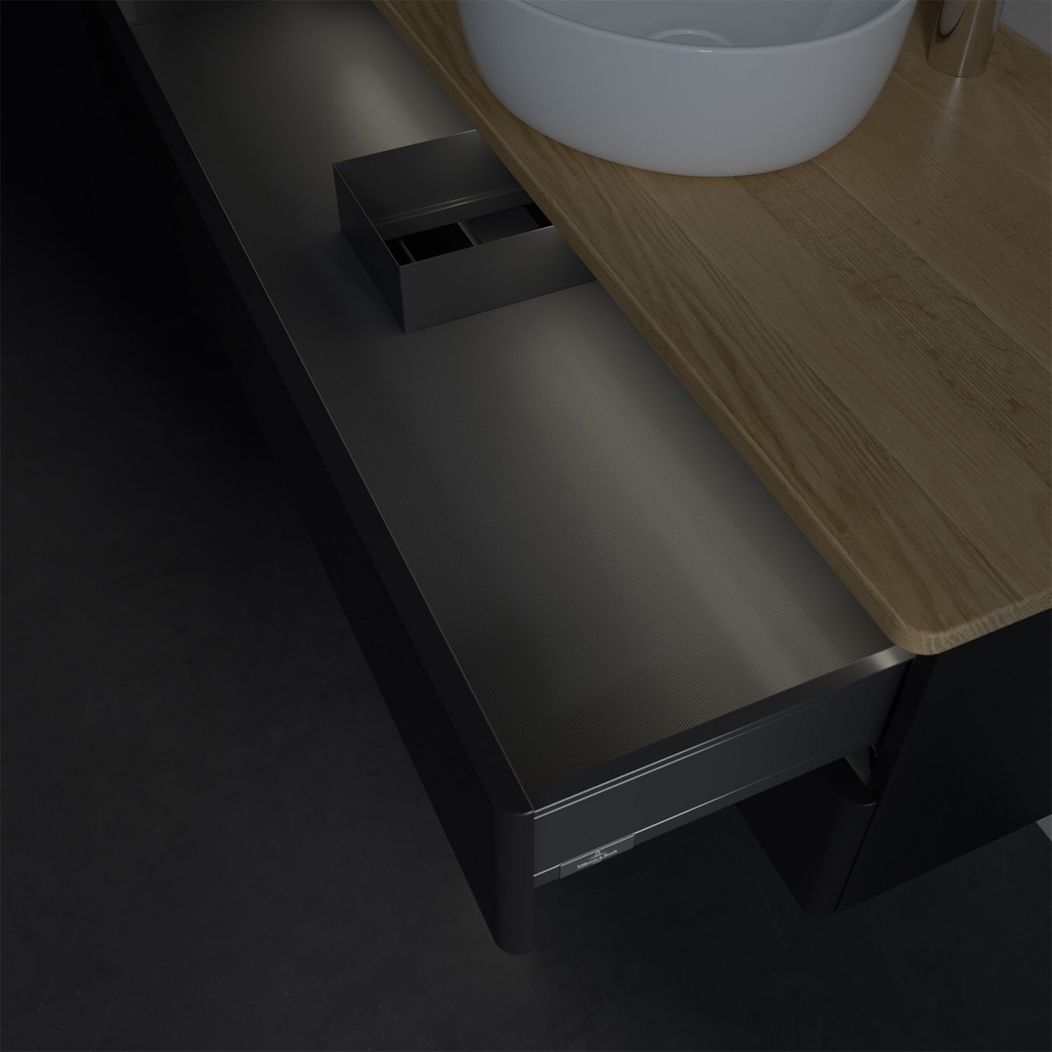 Der wandhängende Antao Waschtischunterschrank von Villeroy & Boch bietet nicht nur jede Menge Stauraum – er ist dank seines naturinspirierten Designs mit seinen abgerundeten Kanten auch noch besonders stilvoll und schafft eine gemütliche Atmosphäre im Badezimmer. Auf der Waschtischplatte bietet sich rechts und links neben dem Waschtisch viel Platz für Zahnbürstenbecher oder Seifenspender. Zwei geräumige Auszüge bieten viel Platz, um alles Notwendige zu verstauen und Ordnung zu halten. Öffnen lassen sie sich durch leichten Druck auf die grifflose Front. Dabei aktiviert sich übrigens die Auszugsbeleuchtung in angenehmem Warmweiß. Dank Vollauszug hat man immer alles im Blick und der Antirutschboden verhindert ein Umfallen oder Verrutschen der Gegenstände. Einfach clever! Für eine besonders leichte Pflege sorgt die mehrschichtig deckend lackierte Oberfläche. Bei der Ausführung in Massivholz wird dank des verarbeiteten Massivholzes jedes Möbel zu einem Unikat, das sich durch das lebendige Naturmaterial durch seine einzigartige Struktur und Maserung auszeichnet.