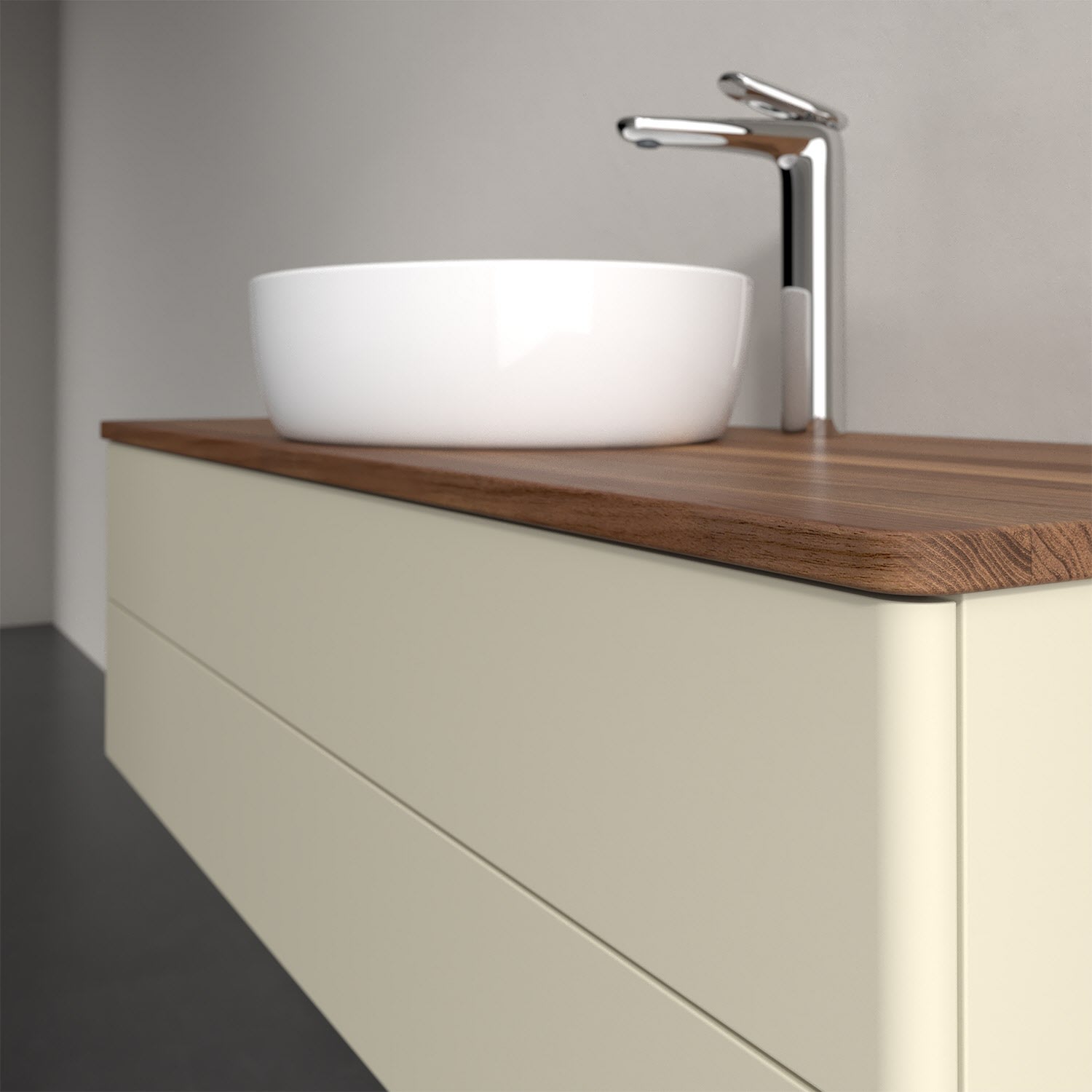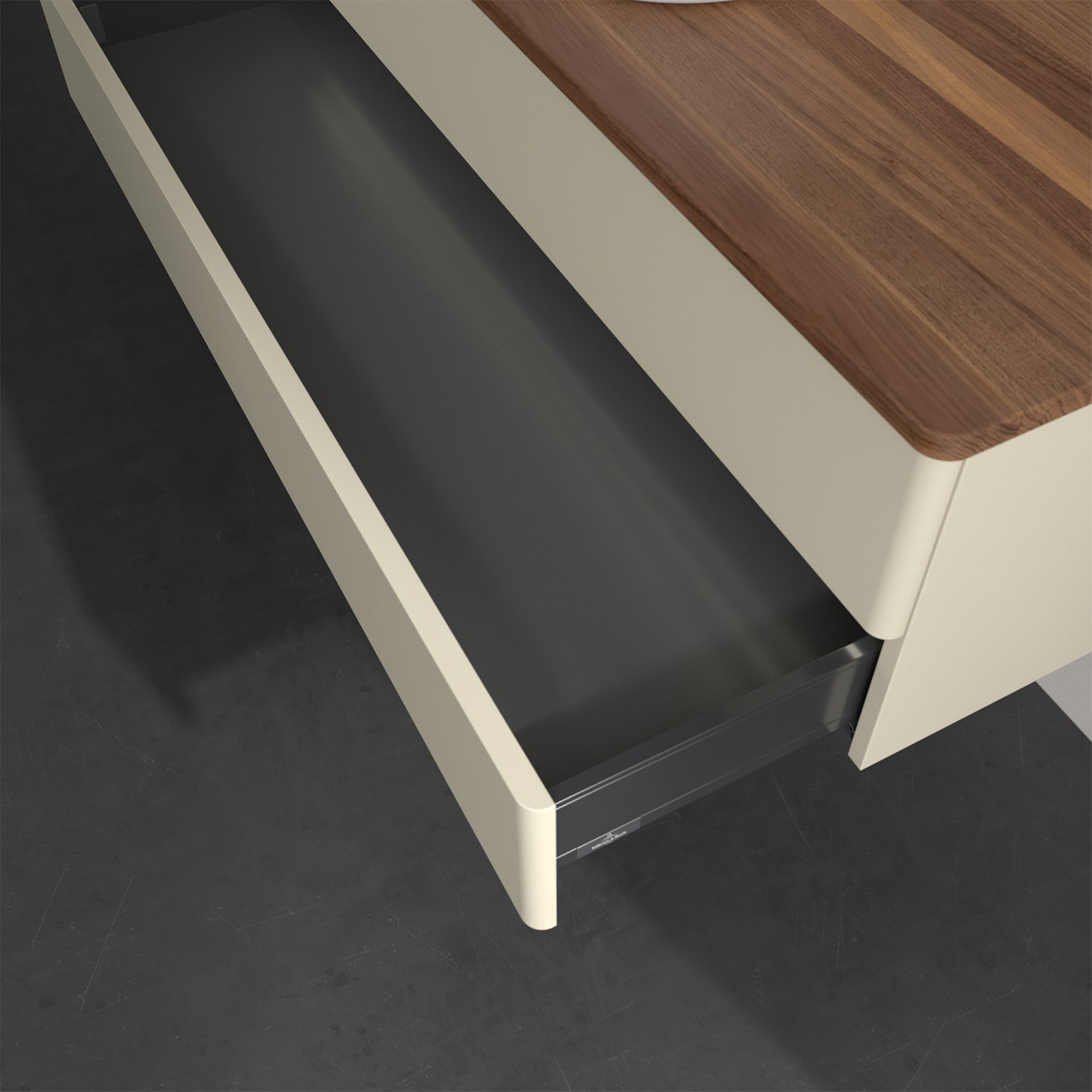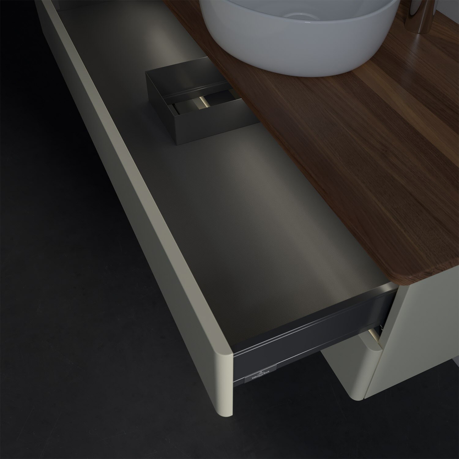 Der wandhängende Antao Waschtischunterschrank von Villeroy & Boch bietet nicht nur jede Menge Stauraum – er ist dank seines naturinspirierten Designs mit seinen abgerundeten Kanten auch noch besonders stilvoll und schafft eine gemütliche Atmosphäre im Badezimmer. Auf der Waschtischplatte bietet sich rechts und links neben dem Waschtisch viel Platz für Zahnbürstenbecher oder Seifenspender. Zwei geräumige Auszüge bieten viel Platz, um alles Notwendige zu verstauen und Ordnung zu halten. Öffnen lassen sie sich durch leichten Druck auf die grifflose Front. Dabei aktiviert sich übrigens die Auszugsbeleuchtung in angenehmem Warmweiß. Dank Vollauszug hat man immer alles im Blick und der Antirutschboden verhindert ein Umfallen oder Verrutschen der Gegenstände. Einfach clever! Für eine besonders leichte Pflege sorgt die mehrschichtig deckend lackierte Oberfläche. Bei der Ausführung in Massivholz wird dank des verarbeiteten Massivholzes jedes Möbel zu einem Unikat, das sich durch das lebendige Naturmaterial durch seine einzigartige Struktur und Maserung auszeichnet.