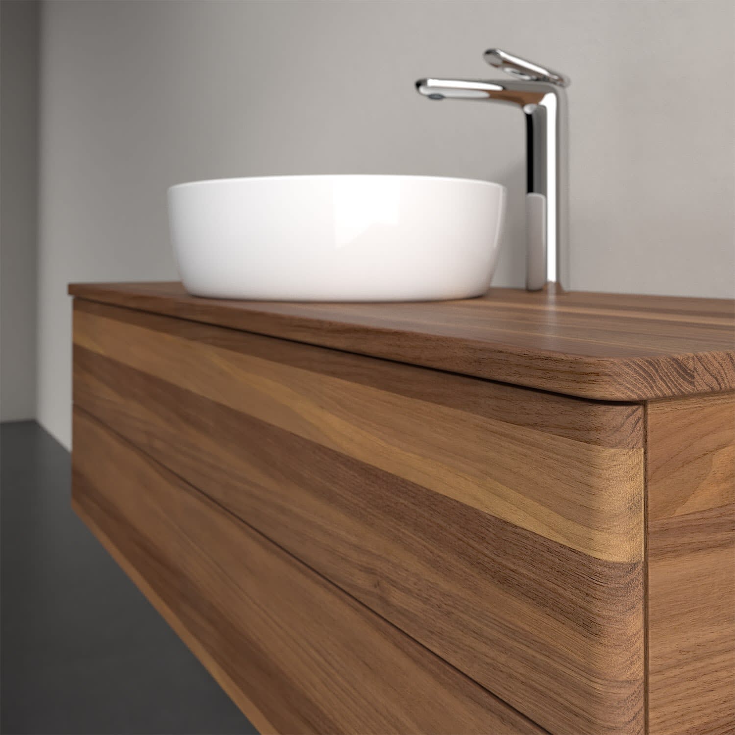 Der wandhängende Antao Waschtischunterschrank von Villeroy & Boch bietet nicht nur jede Menge Stauraum – er ist dank seines naturinspirierten Designs mit seinen abgerundeten Kanten auch noch besonders stilvoll und schafft eine gemütliche Atmosphäre im Badezimmer. Auf der Waschtischplatte bietet sich rechts und links neben dem Waschtisch viel Platz für Zahnbürstenbecher oder Seifenspender. Zwei geräumige Auszüge bieten viel Platz, um alles Notwendige zu verstauen und Ordnung zu halten. Öffnen lassen sie sich durch leichten Druck auf die grifflose Front. Dabei aktiviert sich übrigens die Auszugsbeleuchtung in angenehmem Warmweiß. Dank Vollauszug hat man immer alles im Blick und der Antirutschboden verhindert ein Umfallen oder Verrutschen der Gegenstände. Einfach clever! Für eine besonders leichte Pflege sorgt die mehrschichtig deckend lackierte Oberfläche. Bei der Ausführung in Massivholz wird dank des verarbeiteten Massivholzes jedes Möbel zu einem Unikat, das sich durch das lebendige Naturmaterial durch seine einzigartige Struktur und Maserung auszeichnet.