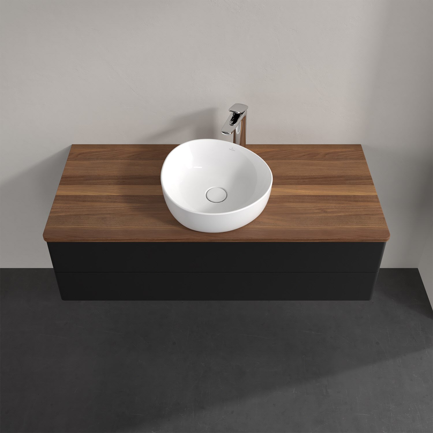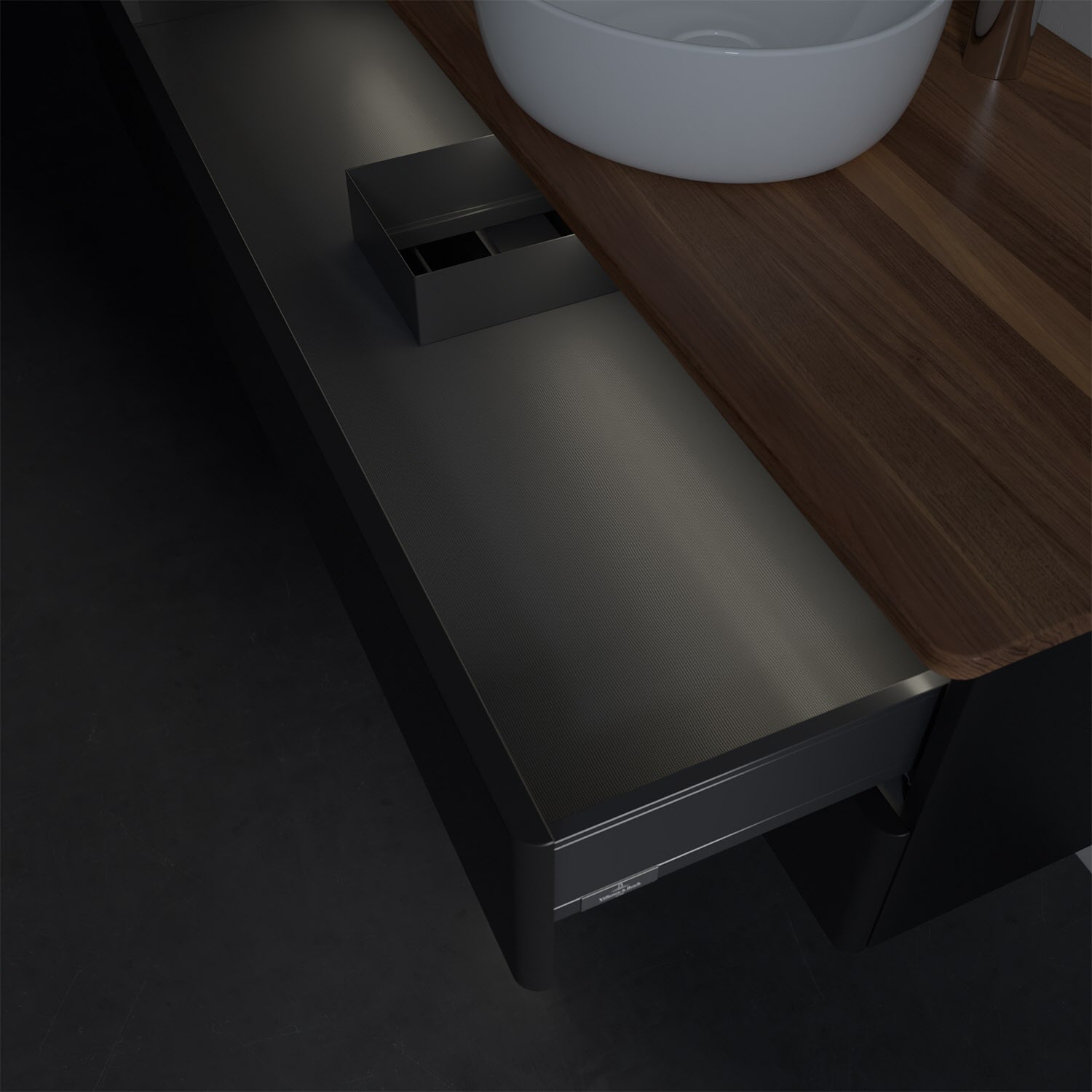 Der wandhängende Antao Waschtischunterschrank von Villeroy & Boch bietet nicht nur jede Menge Stauraum – er ist dank seines naturinspirierten Designs mit seinen abgerundeten Kanten auch noch besonders stilvoll und schafft eine gemütliche Atmosphäre im Badezimmer. Auf der Waschtischplatte bietet sich rechts und links neben dem Waschtisch viel Platz für Zahnbürstenbecher oder Seifenspender. Zwei geräumige Auszüge bieten viel Platz, um alles Notwendige zu verstauen und Ordnung zu halten. Öffnen lassen sie sich durch leichten Druck auf die grifflose Front. Dabei aktiviert sich übrigens die Auszugsbeleuchtung in angenehmem Warmweiß. Dank Vollauszug hat man immer alles im Blick und der Antirutschboden verhindert ein Umfallen oder Verrutschen der Gegenstände. Einfach clever! Für eine besonders leichte Pflege sorgt die mehrschichtig deckend lackierte Oberfläche. Bei der Ausführung in Massivholz wird dank des verarbeiteten Massivholzes jedes Möbel zu einem Unikat, das sich durch das lebendige Naturmaterial durch seine einzigartige Struktur und Maserung auszeichnet.
