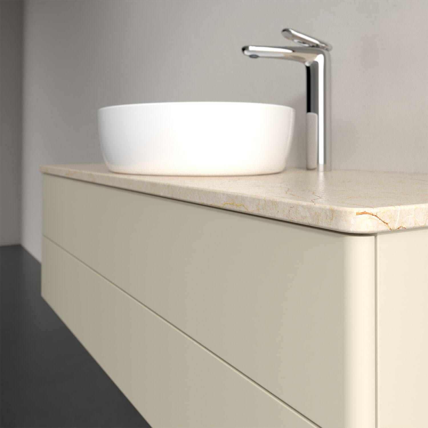 Für diesen Waschbeckenunterschrank stehen Ihnen Aufsatzwaschtische aus verschiedenen Serien zur Verfügung (siehe "Passliste" unter Downloads). Ein ausgewähltes Beispiel finden Sie im Zubehör. Den Waschtisch bitte separat mitbestellen.
