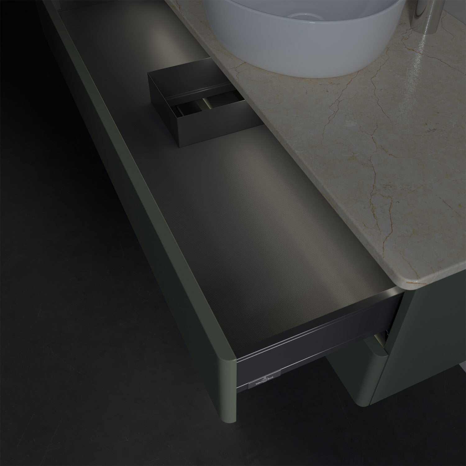 Der wandhängende Antao Waschtischunterschrank von Villeroy & Boch bietet nicht nur jede Menge Stauraum – er ist dank seines naturinspirierten Designs mit seinen abgerundeten Kanten auch noch besonders stilvoll und schafft eine gemütliche Atmosphäre im Badezimmer. Auf der Waschtischplatte bietet sich rechts und links neben dem Waschtisch viel Platz für Zahnbürstenbecher oder Seifenspender. Zwei geräumige Auszüge bieten viel Platz, um alles Notwendige zu verstauen und Ordnung zu halten. Öffnen lassen sie sich durch leichten Druck auf die grifflose Front. Dabei aktiviert sich übrigens die Auszugsbeleuchtung in angenehmem Warmweiß. Dank Vollauszug hat man immer alles im Blick und der Antirutschboden verhindert ein Umfallen oder Verrutschen der Gegenstände. Einfach clever! Für eine besonders leichte Pflege sorgt die mehrschichtig deckend lackierte Oberfläche. Bei der Ausführung in Massivholz wird dank des verarbeiteten Massivholzes jedes Möbel zu einem Unikat, das sich durch das lebendige Naturmaterial durch seine einzigartige Struktur und Maserung auszeichnet.