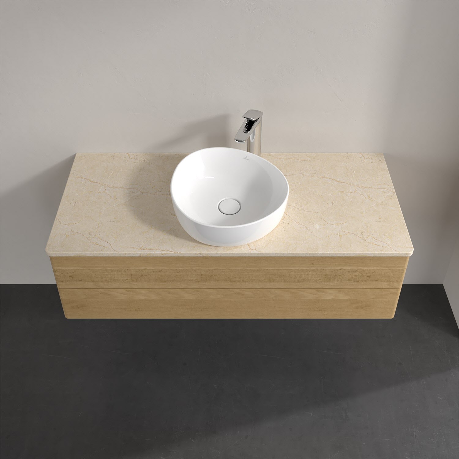 Für diesen Waschbeckenunterschrank stehen Ihnen Aufsatzwaschtische aus verschiedenen Serien zur Verfügung (siehe "Passliste" unter Downloads). Ein ausgewähltes Beispiel finden Sie im Zubehör. Den Waschtisch bitte separat mitbestellen.