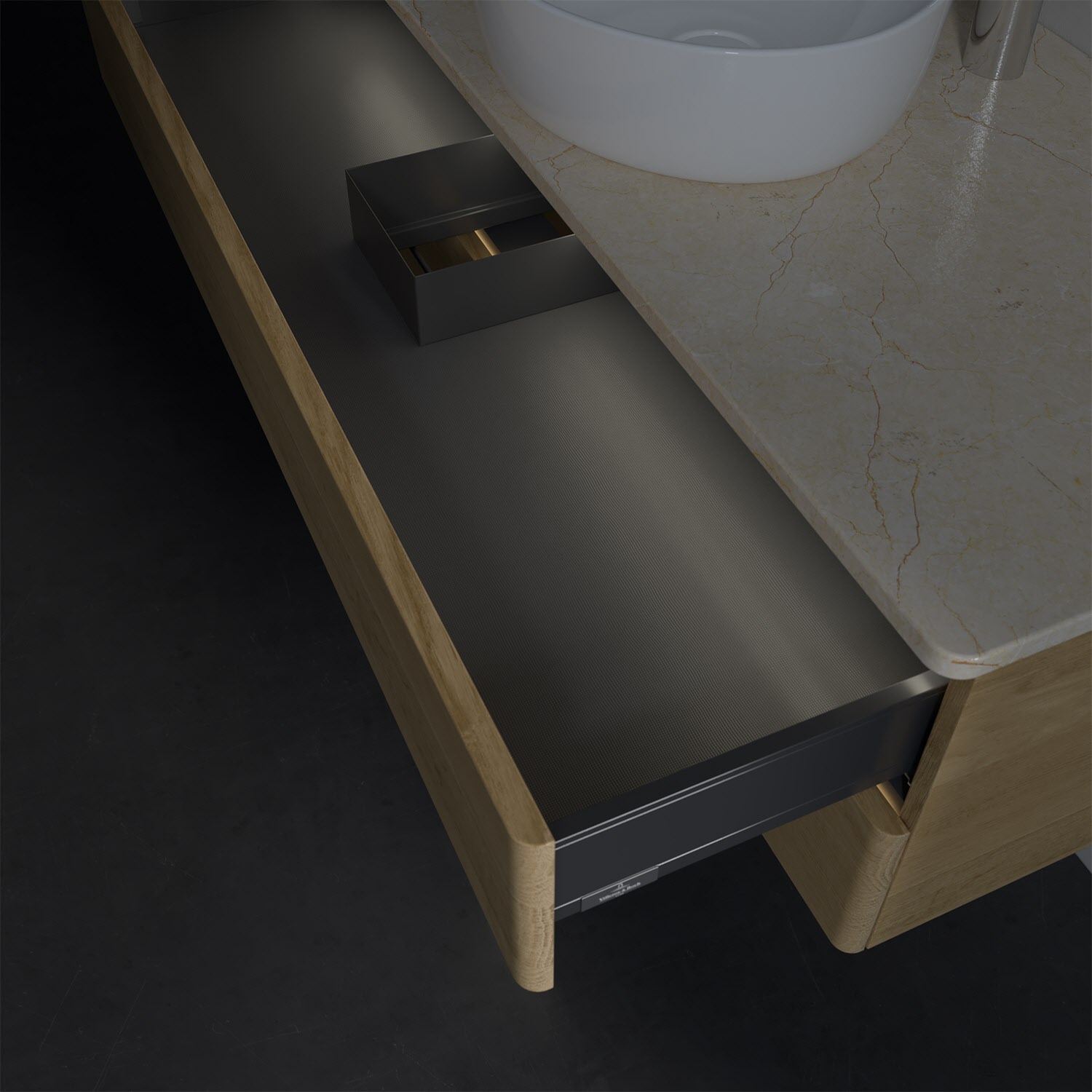 - kein Umfallen oder Verrutschen von Pflegeprodukten in den Schubladen dank rutschhemmendem Boden