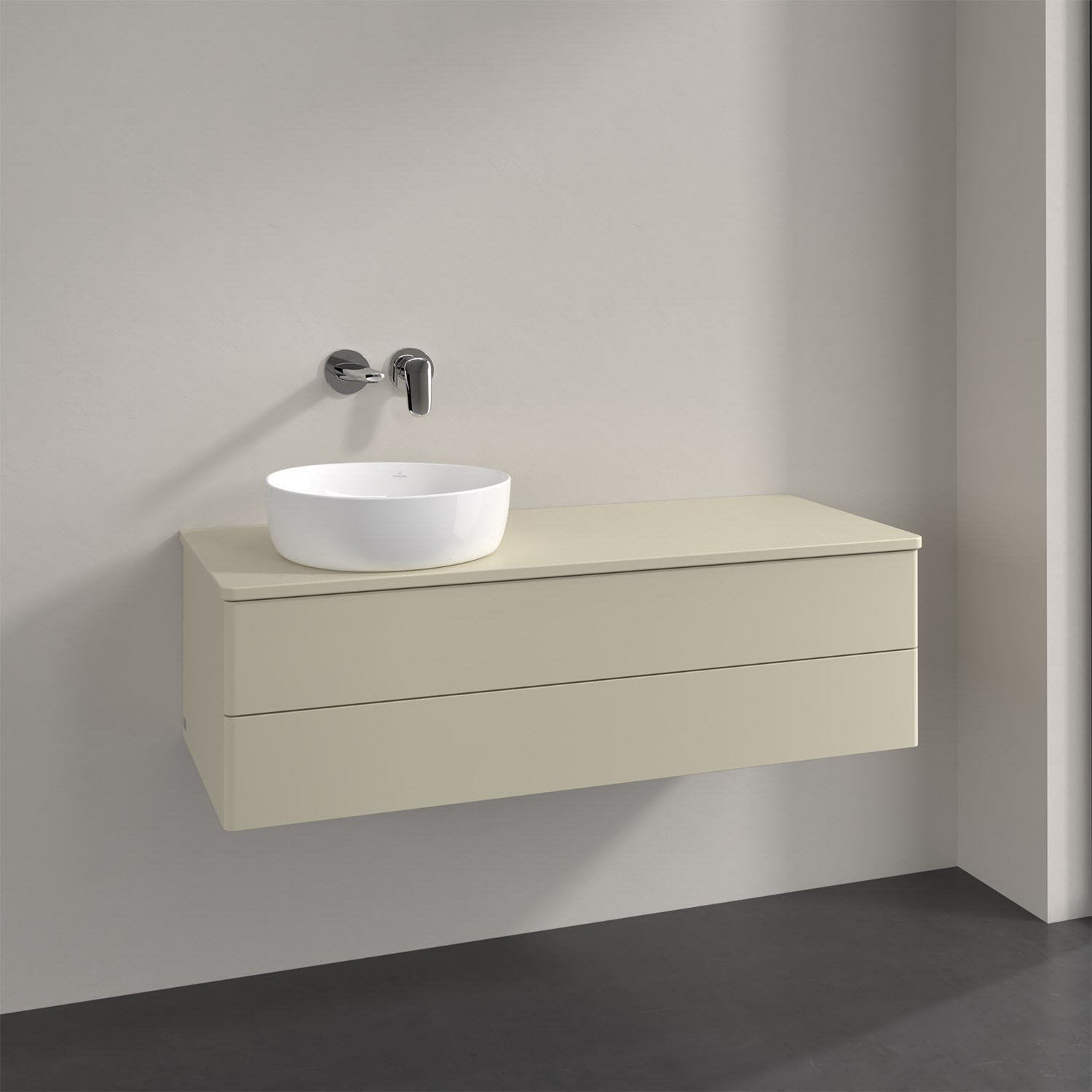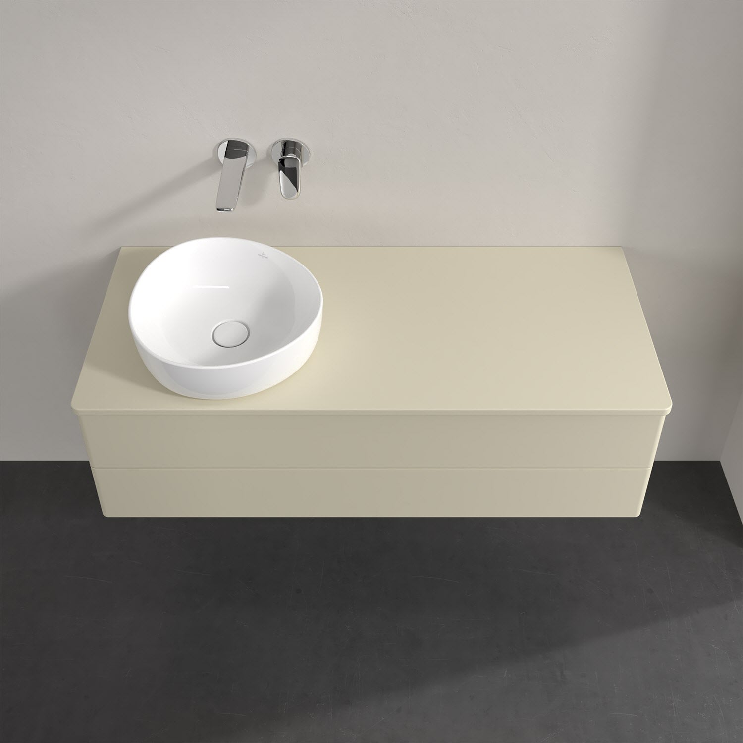 Villeroy & Boch Antao Waschbeckenunterschrank, 120 x 36 cm, 2 Auszüge mit LED-Licht, Front ohne Struktur, mit Hahnloch, für Waschtisch links