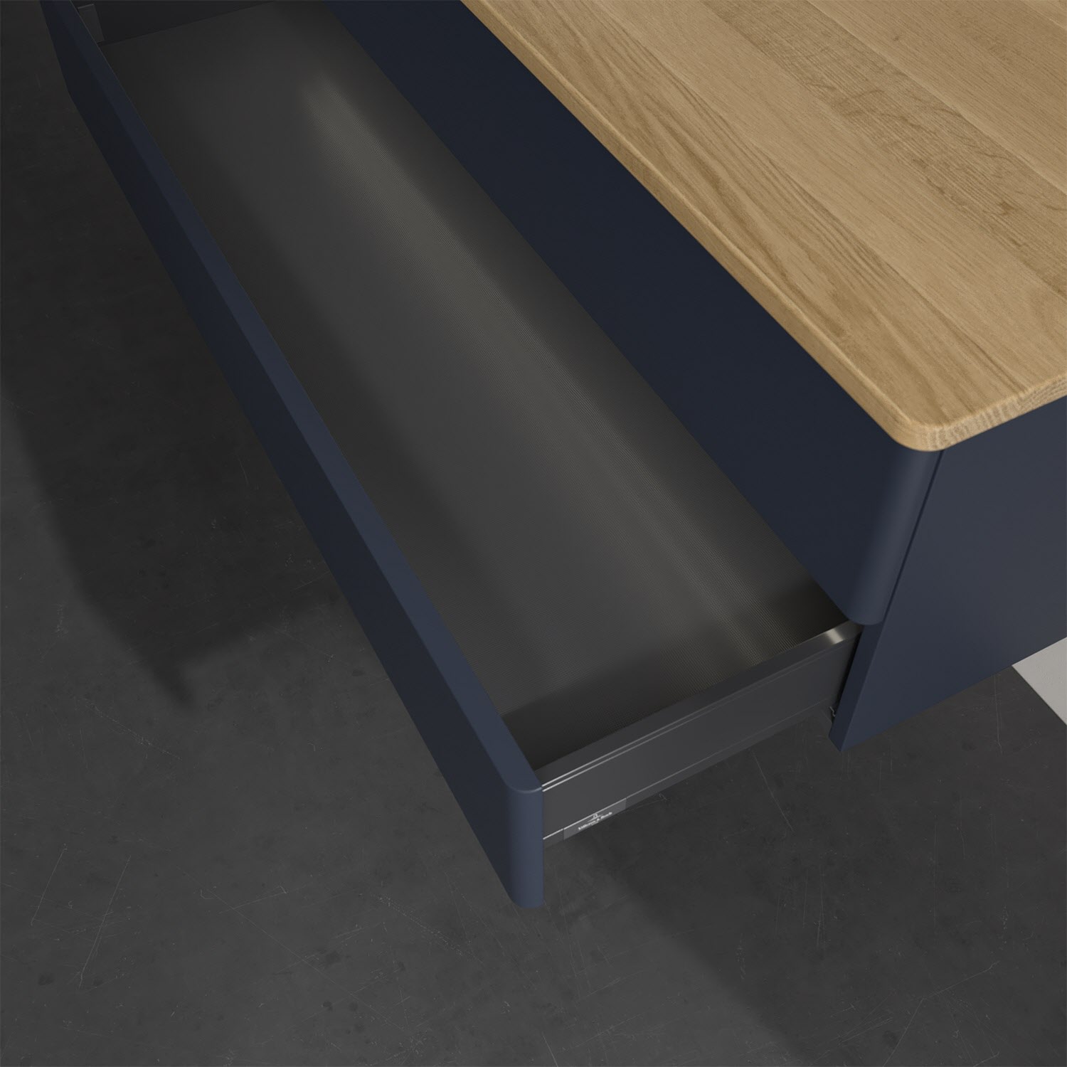 Der wandhängende Antao Waschtischunterschrank von Villeroy & Boch bietet nicht nur jede Menge Stauraum – er ist dank seines naturinspirierten Designs mit seinen abgerundeten Kanten auch noch besonders stilvoll und schafft eine gemütliche Atmosphäre im Badezimmer. Auf der Waschtischplatte bietet sich seitlich des Waschtischs viel Platz für Zahnbürstenbecher oder Seifenspender. Zwei geräumige Auszüge bieten viel Platz, um alles Notwendige zu verstauen und Ordnung zu halten. Öffnen lassen sie sich durch leichten Druck auf die grifflose Front. Dabei aktiviert sich übrigens die Auszugsbeleuchtung in angenehmem Warmweiß. Dank Vollauszug hat man immer alles im Blick und der Antirutschboden verhindert ein Umfallen oder Verrutschen der Gegenstände. Einfach clever! Für eine besonders leichte Pflege sorgt die mehrschichtig deckend lackierte Oberfläche. Bei der Ausführung in Massivholz wird dank des verarbeiteten Massivholzes jedes Möbel zu einem Unikat, das sich durch das lebendige Naturmaterial durch seine einzigartige Struktur und Maserung auszeichnet.