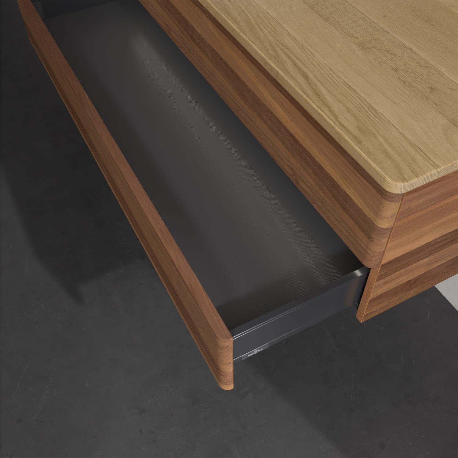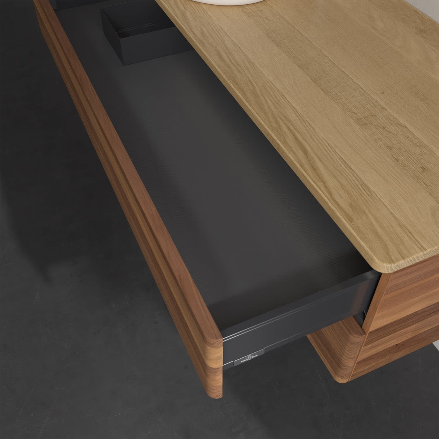 Der wandhängende Antao Waschtischunterschrank von Villeroy & Boch bietet nicht nur jede Menge Stauraum – er ist dank seines naturinspirierten Designs mit seinen abgerundeten Kanten auch noch besonders stilvoll und schafft eine gemütliche Atmosphäre im Badezimmer. Auf der Waschtischplatte bietet sich seitlich des Waschtischs viel Platz für Zahnbürstenbecher oder Seifenspender. Zwei geräumige Auszüge bieten viel Platz, um alles Notwendige zu verstauen und Ordnung zu halten. Öffnen lassen sie sich durch leichten Druck auf die grifflose Front. Dabei aktiviert sich übrigens die Auszugsbeleuchtung in angenehmem Warmweiß. Dank Vollauszug hat man immer alles im Blick und der Antirutschboden verhindert ein Umfallen oder Verrutschen der Gegenstände. Einfach clever! Für eine besonders leichte Pflege sorgt die mehrschichtig deckend lackierte Oberfläche. Bei der Ausführung in Massivholz wird dank des verarbeiteten Massivholzes jedes Möbel zu einem Unikat, das sich durch das lebendige Naturmaterial durch seine einzigartige Struktur und Maserung auszeichnet.