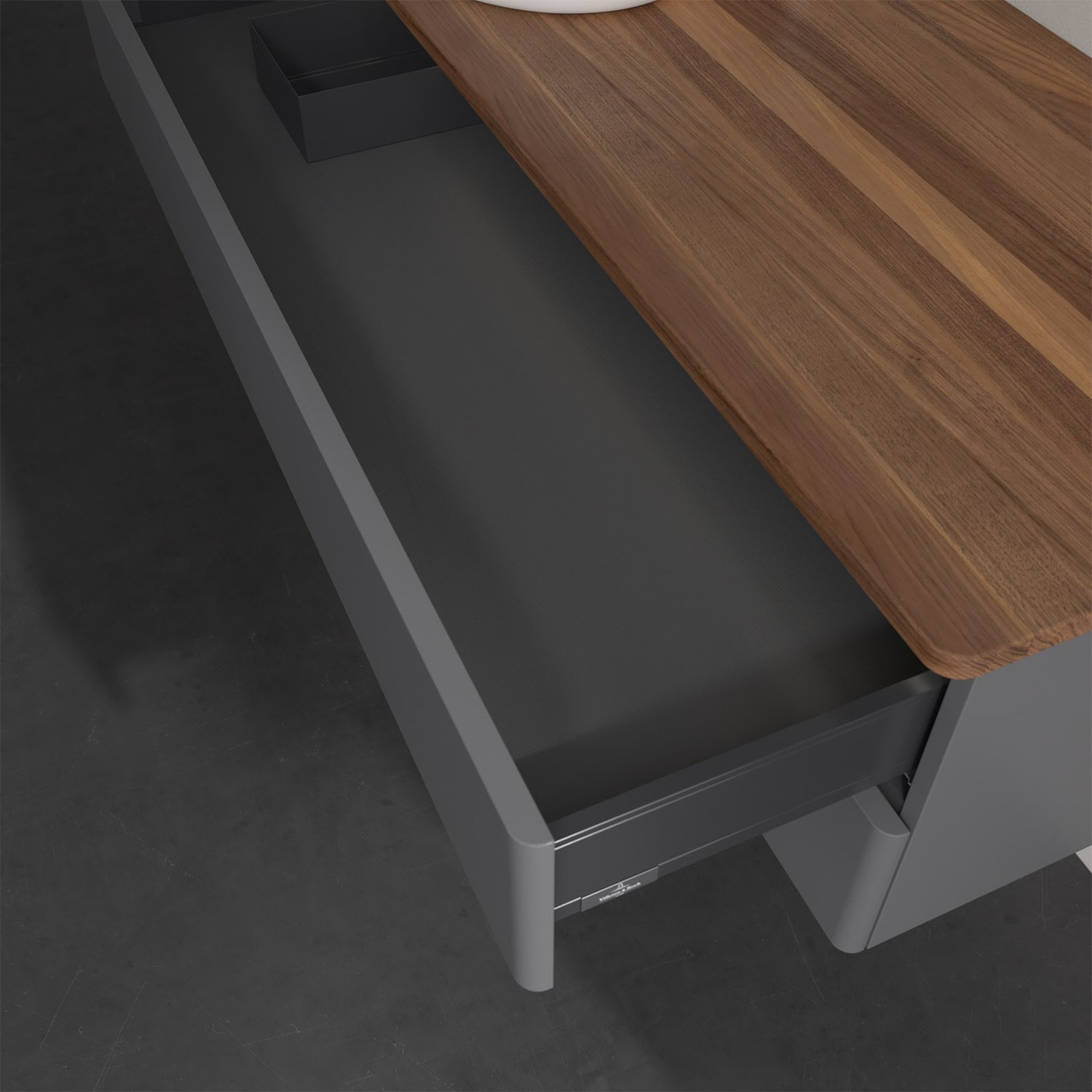Der wandhängende Antao Waschtischunterschrank von Villeroy & Boch bietet nicht nur jede Menge Stauraum – er ist dank seines naturinspirierten Designs mit seinen abgerundeten Kanten auch noch besonders stilvoll und schafft eine gemütliche Atmosphäre im Badezimmer. Auf der Waschtischplatte bietet sich seitlich des Waschtischs viel Platz für Zahnbürstenbecher oder Seifenspender. Zwei geräumige Auszüge bieten viel Platz, um alles Notwendige zu verstauen und Ordnung zu halten. Öffnen lassen sie sich durch leichten Druck auf die grifflose Front. Dabei aktiviert sich übrigens die Auszugsbeleuchtung in angenehmem Warmweiß. Dank Vollauszug hat man immer alles im Blick und der Antirutschboden verhindert ein Umfallen oder Verrutschen der Gegenstände. Einfach clever! Für eine besonders leichte Pflege sorgt die mehrschichtig deckend lackierte Oberfläche. Bei der Ausführung in Massivholz wird dank des verarbeiteten Massivholzes jedes Möbel zu einem Unikat, das sich durch das lebendige Naturmaterial durch seine einzigartige Struktur und Maserung auszeichnet.