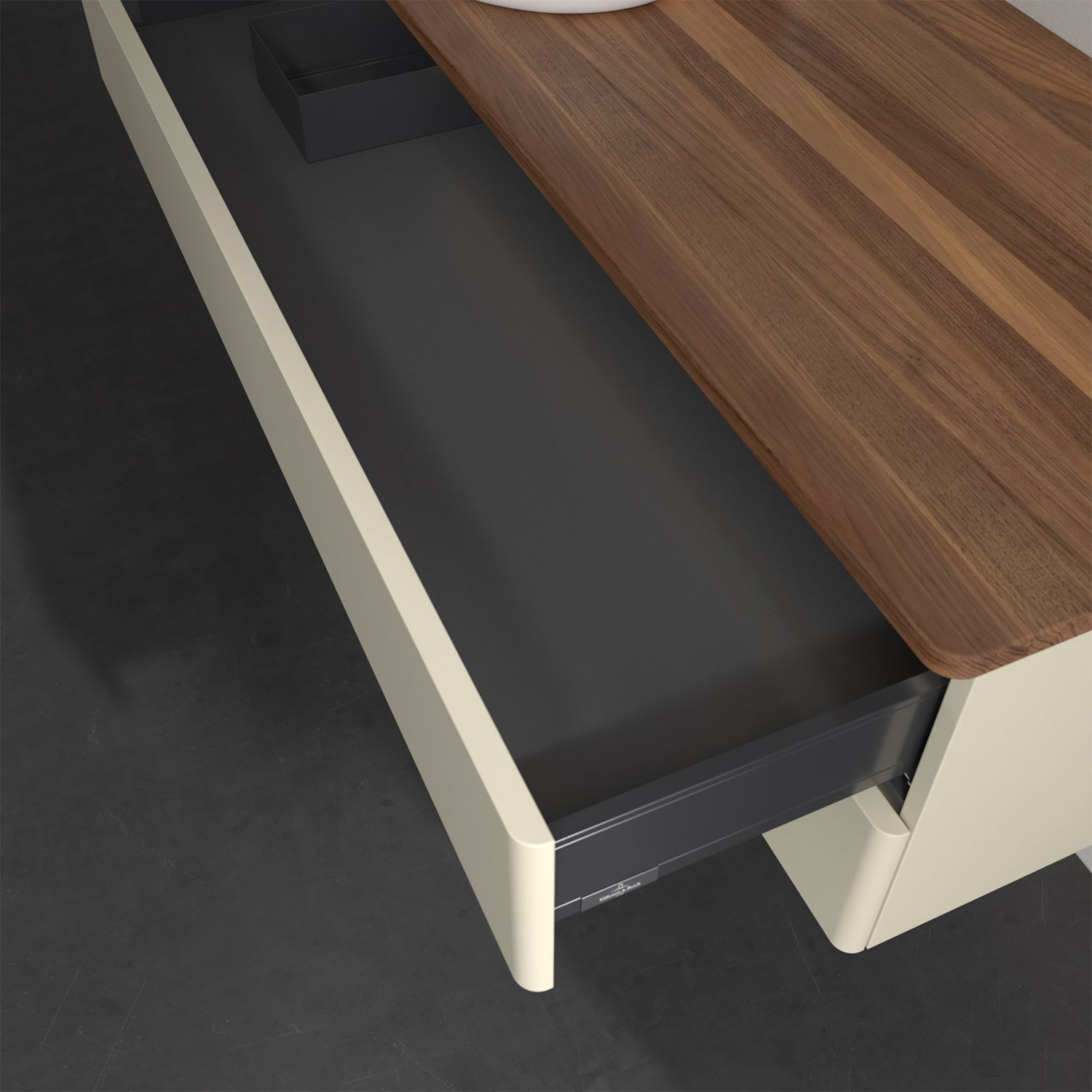 Der wandhängende Antao Waschtischunterschrank von Villeroy & Boch bietet nicht nur jede Menge Stauraum – er ist dank seines naturinspirierten Designs mit seinen abgerundeten Kanten auch noch besonders stilvoll und schafft eine gemütliche Atmosphäre im Badezimmer. Auf der Waschtischplatte bietet sich seitlich des Waschtischs viel Platz für Zahnbürstenbecher oder Seifenspender. Zwei geräumige Auszüge bieten viel Platz, um alles Notwendige zu verstauen und Ordnung zu halten. Öffnen lassen sie sich durch leichten Druck auf die grifflose Front. Dabei aktiviert sich übrigens die Auszugsbeleuchtung in angenehmem Warmweiß. Dank Vollauszug hat man immer alles im Blick und der Antirutschboden verhindert ein Umfallen oder Verrutschen der Gegenstände. Einfach clever! Für eine besonders leichte Pflege sorgt die mehrschichtig deckend lackierte Oberfläche. Bei der Ausführung in Massivholz wird dank des verarbeiteten Massivholzes jedes Möbel zu einem Unikat, das sich durch das lebendige Naturmaterial durch seine einzigartige Struktur und Maserung auszeichnet.