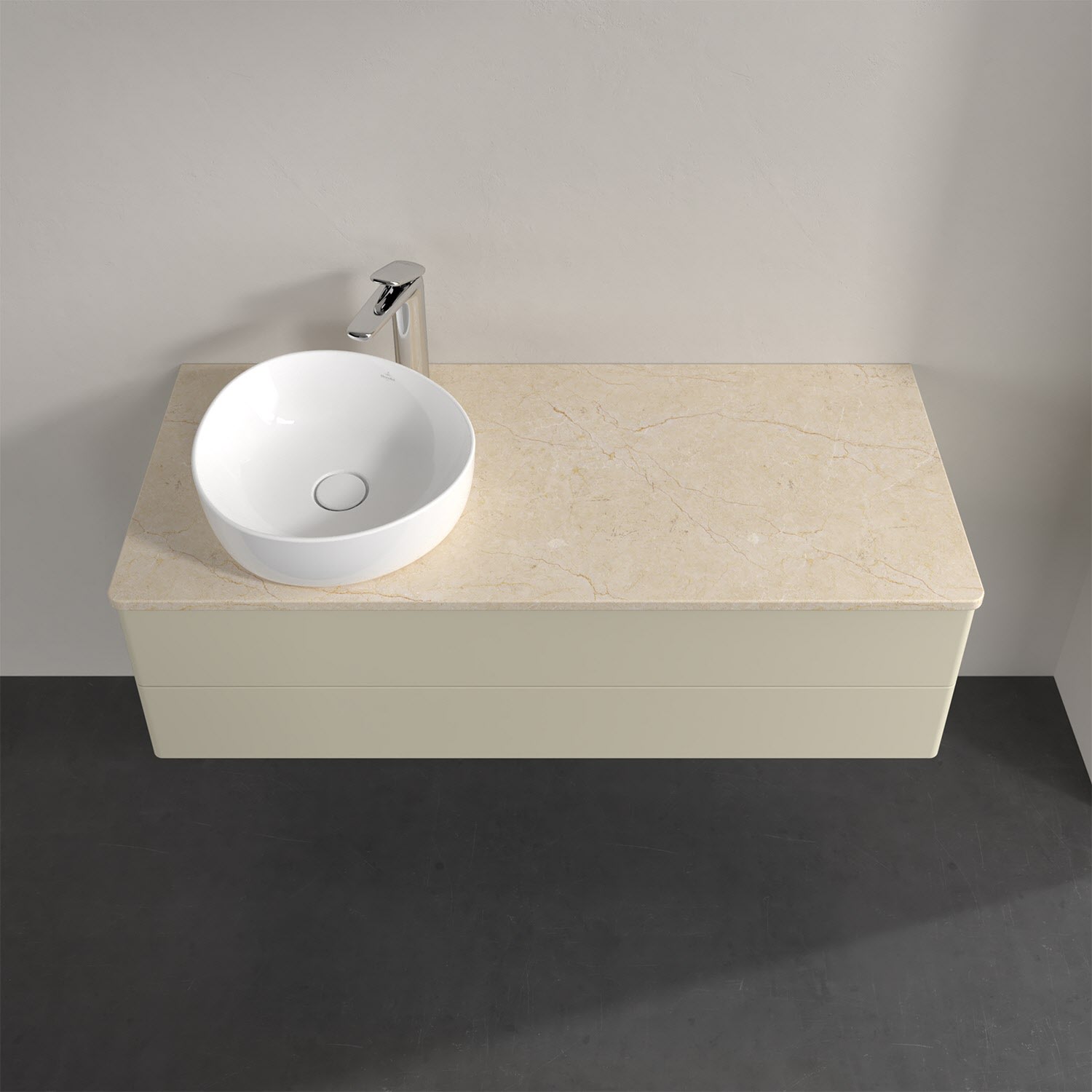 Für diesen Waschbeckenunterschrank stehen Ihnen Aufsatzwaschtische aus verschiedenen Serien zur Verfügung (siehe "Passliste" unter Downloads). Ein ausgewähltes Beispiel finden Sie im Zubehör. Den Waschtisch bitte separat mitbestellen.