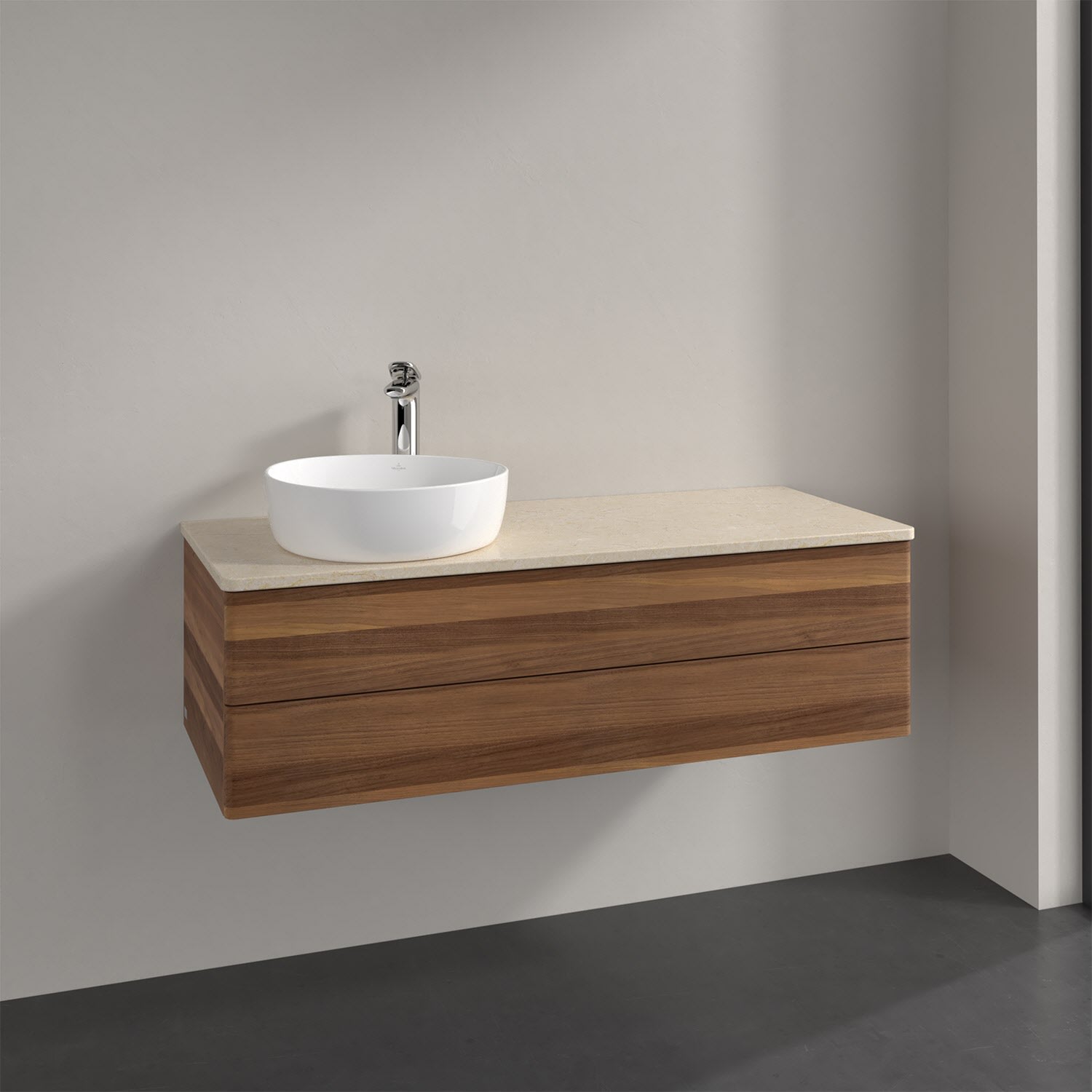 Villeroy & Boch Antao Waschbeckenunterschrank, 120 x 36 cm, 2 Auszüge mit LED-Licht, Front ohne Struktur, mit Hahnloch, für Waschtisch links