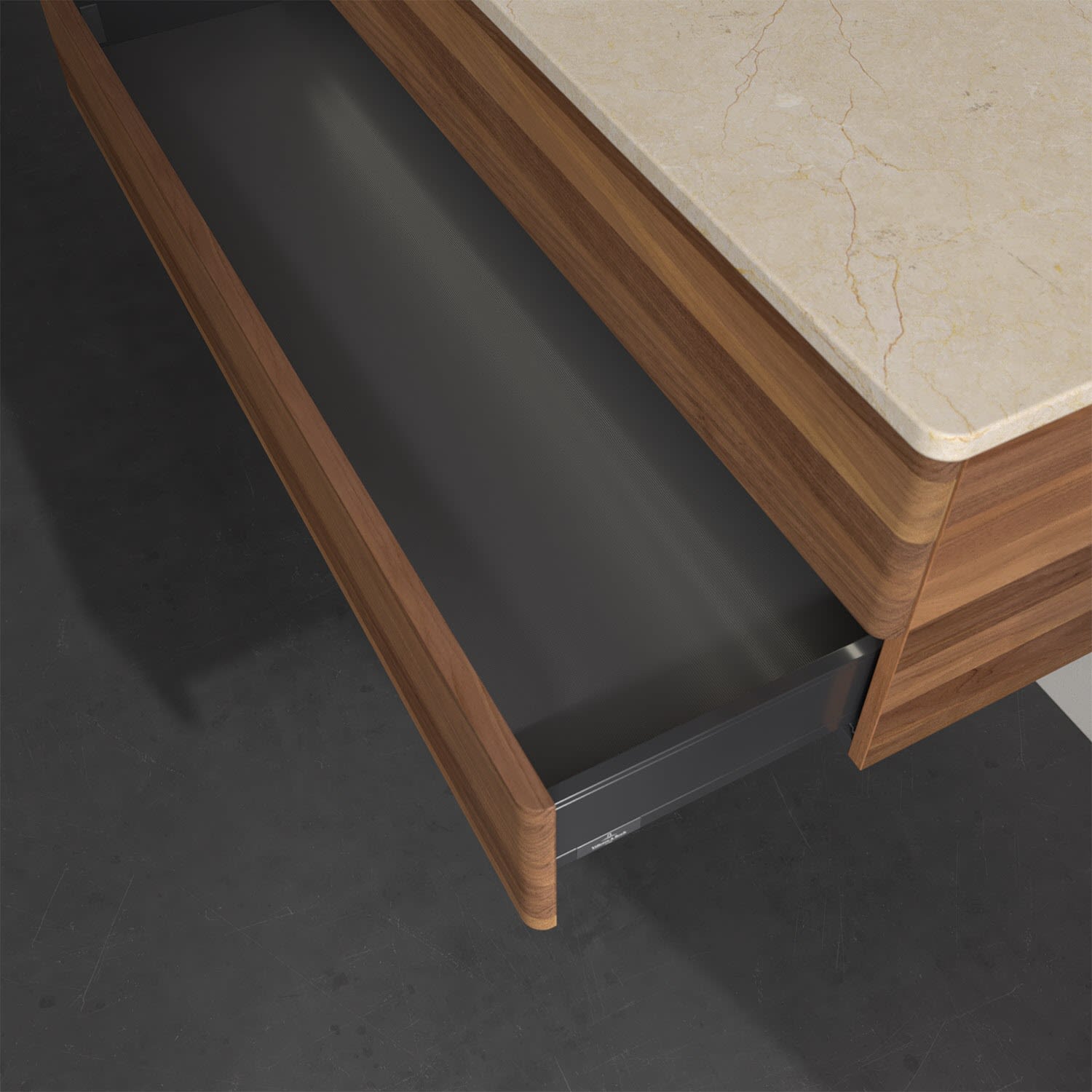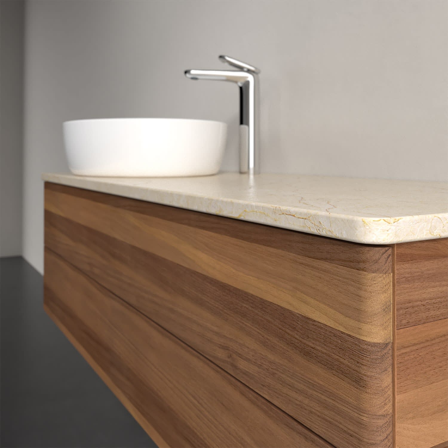 Der wandhängende Antao Waschtischunterschrank von Villeroy & Boch bietet nicht nur jede Menge Stauraum – er ist dank seines naturinspirierten Designs mit seinen abgerundeten Kanten auch noch besonders stilvoll und schafft eine gemütliche Atmosphäre im Badezimmer. Auf der Waschtischplatte bietet sich seitlich des Waschtischs viel Platz für Zahnbürstenbecher oder Seifenspender. Zwei geräumige Auszüge bieten viel Platz, um alles Notwendige zu verstauen und Ordnung zu halten. Öffnen lassen sie sich durch leichten Druck auf die grifflose Front. Dabei aktiviert sich übrigens die Auszugsbeleuchtung in angenehmem Warmweiß. Dank Vollauszug hat man immer alles im Blick und der Antirutschboden verhindert ein Umfallen oder Verrutschen der Gegenstände. Einfach clever! Für eine besonders leichte Pflege sorgt die mehrschichtig deckend lackierte Oberfläche. Bei der Ausführung in Massivholz wird dank des verarbeiteten Massivholzes jedes Möbel zu einem Unikat, das sich durch das lebendige Naturmaterial durch seine einzigartige Struktur und Maserung auszeichnet.