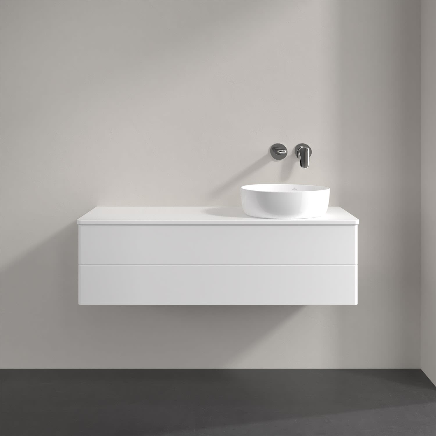 Villeroy & Boch Antao Waschbeckenunterschrank, 120 x 36 cm, 2 Auszüge mit LED-Licht, Front ohne Struktur, mit Hahnloch, für Waschtisch rechts