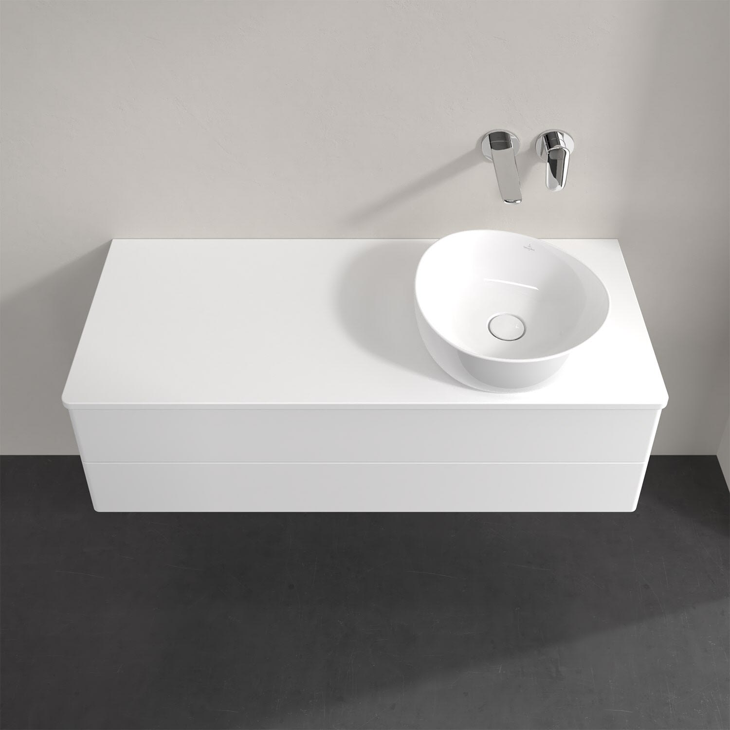 Für diesen Waschbeckenunterschrank stehen Ihnen Aufsatzwaschtische aus verschiedenen Serien zur Verfügung (siehe "Passliste" unter Downloads). Ein ausgewähltes Beispiel finden Sie im Zubehör. Den Waschtisch bitte separat mitbestellen.