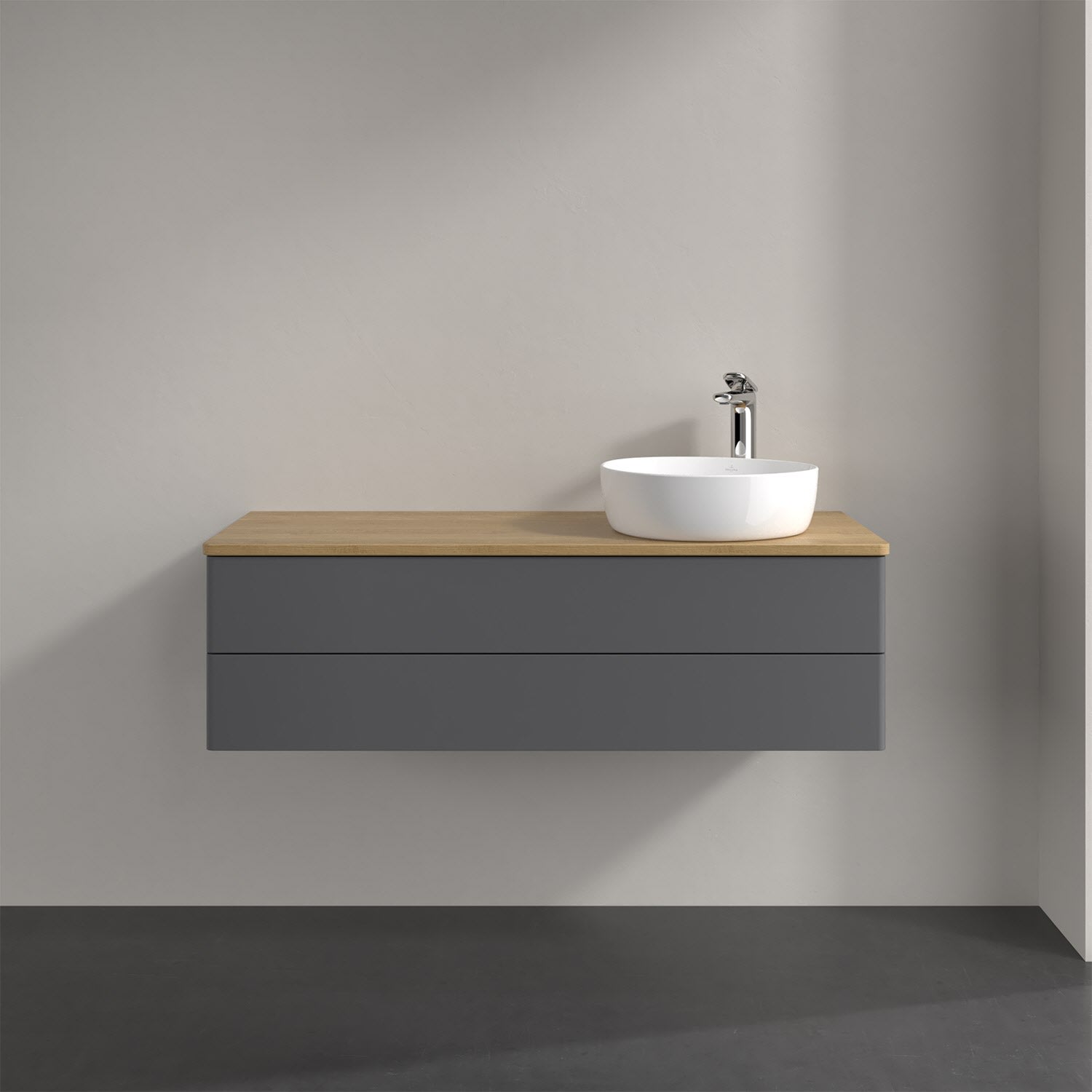 Der wandhängende Antao Waschtischunterschrank von Villeroy & Boch bietet nicht nur jede Menge Stauraum – er ist dank seines naturinspirierten Designs mit seinen abgerundeten Kanten auch noch besonders stilvoll und schafft eine gemütliche Atmosphäre im Badezimmer. Auf der Waschtischplatte bietet sich seitlich des Waschtischs viel Platz für Zahnbürstenbecher oder Seifenspender. Zwei geräumige Auszüge bieten viel Platz, um alles Notwendige zu verstauen und Ordnung zu halten. Öffnen lassen sie sich durch leichten Druck auf die grifflose Front. Dabei aktiviert sich übrigens die Auszugsbeleuchtung in angenehmem Warmweiß. Dank Vollauszug hat man immer alles im Blick und der Antirutschboden verhindert ein Umfallen oder Verrutschen der Gegenstände. Einfach clever! Für eine besonders leichte Pflege sorgt die mehrschichtig deckend lackierte Oberfläche. Bei der Ausführung in Massivholz wird dank des verarbeiteten Massivholzes jedes Möbel zu einem Unikat, das sich durch das lebendige Naturmaterial durch seine einzigartige Struktur und Maserung auszeichnet.