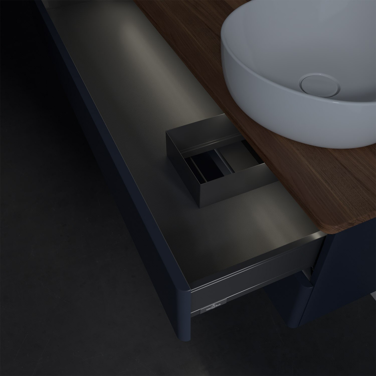 Der wandhängende Antao Waschtischunterschrank von Villeroy & Boch bietet nicht nur jede Menge Stauraum – er ist dank seines naturinspirierten Designs mit seinen abgerundeten Kanten auch noch besonders stilvoll und schafft eine gemütliche Atmosphäre im Badezimmer. Auf der Waschtischplatte bietet sich seitlich des Waschtischs viel Platz für Zahnbürstenbecher oder Seifenspender. Zwei geräumige Auszüge bieten viel Platz, um alles Notwendige zu verstauen und Ordnung zu halten. Öffnen lassen sie sich durch leichten Druck auf die grifflose Front. Dabei aktiviert sich übrigens die Auszugsbeleuchtung in angenehmem Warmweiß. Dank Vollauszug hat man immer alles im Blick und der Antirutschboden verhindert ein Umfallen oder Verrutschen der Gegenstände. Einfach clever! Für eine besonders leichte Pflege sorgt die mehrschichtig deckend lackierte Oberfläche. Bei der Ausführung in Massivholz wird dank des verarbeiteten Massivholzes jedes Möbel zu einem Unikat, das sich durch das lebendige Naturmaterial durch seine einzigartige Struktur und Maserung auszeichnet.