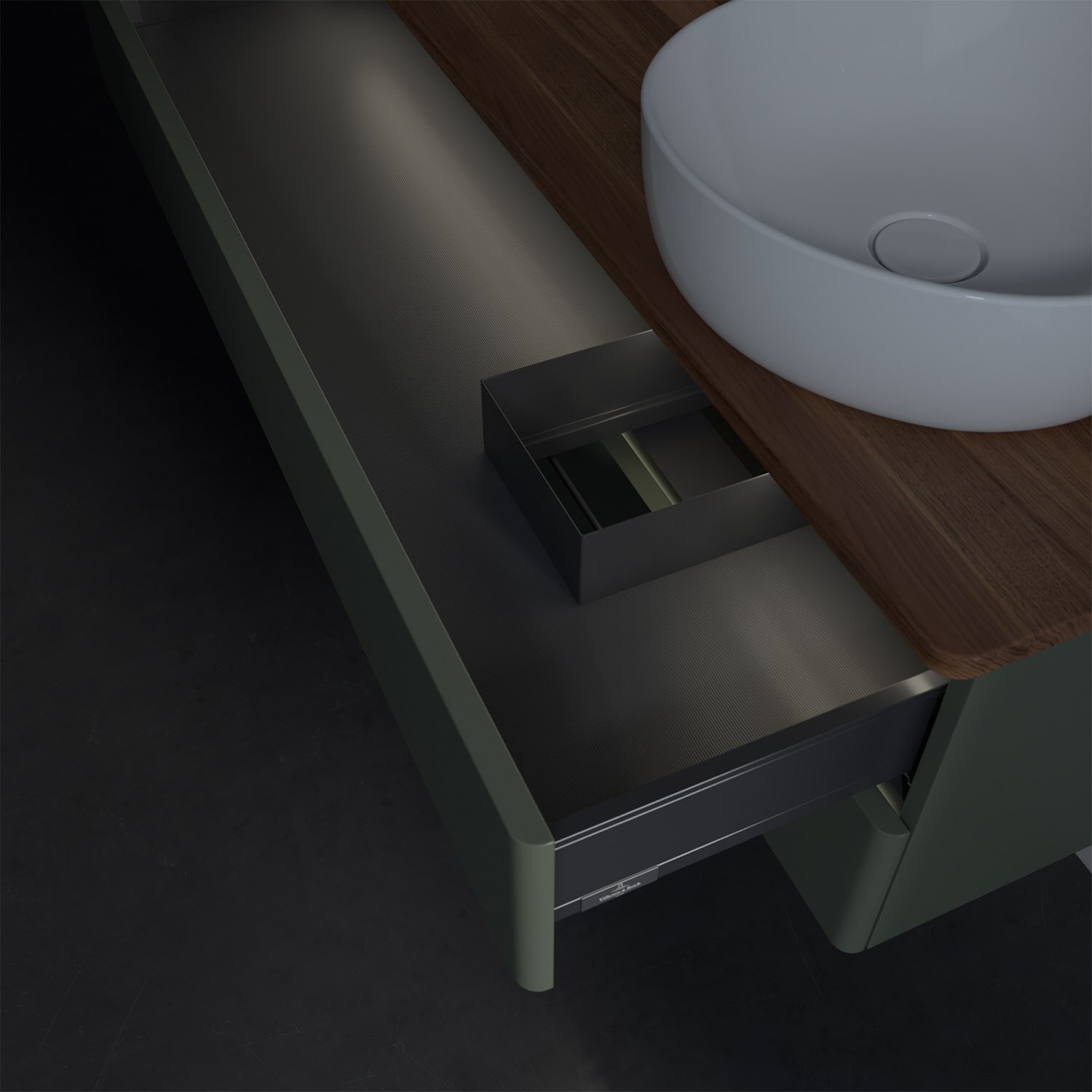 Der wandhängende Antao Waschtischunterschrank von Villeroy & Boch bietet nicht nur jede Menge Stauraum – er ist dank seines naturinspirierten Designs mit seinen abgerundeten Kanten auch noch besonders stilvoll und schafft eine gemütliche Atmosphäre im Badezimmer. Auf der Waschtischplatte bietet sich seitlich des Waschtischs viel Platz für Zahnbürstenbecher oder Seifenspender. Zwei geräumige Auszüge bieten viel Platz, um alles Notwendige zu verstauen und Ordnung zu halten. Öffnen lassen sie sich durch leichten Druck auf die grifflose Front. Dabei aktiviert sich übrigens die Auszugsbeleuchtung in angenehmem Warmweiß. Dank Vollauszug hat man immer alles im Blick und der Antirutschboden verhindert ein Umfallen oder Verrutschen der Gegenstände. Einfach clever! Für eine besonders leichte Pflege sorgt die mehrschichtig deckend lackierte Oberfläche. Bei der Ausführung in Massivholz wird dank des verarbeiteten Massivholzes jedes Möbel zu einem Unikat, das sich durch das lebendige Naturmaterial durch seine einzigartige Struktur und Maserung auszeichnet.
