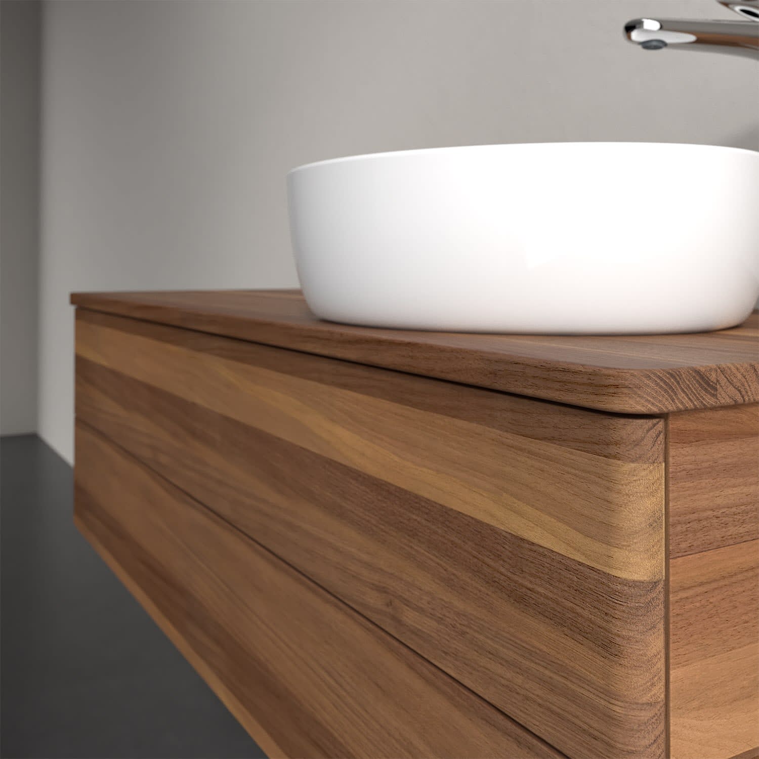 Der wandhängende Antao Waschtischunterschrank von Villeroy & Boch bietet nicht nur jede Menge Stauraum – er ist dank seines naturinspirierten Designs mit seinen abgerundeten Kanten auch noch besonders stilvoll und schafft eine gemütliche Atmosphäre im Badezimmer. Auf der Waschtischplatte bietet sich seitlich des Waschtischs viel Platz für Zahnbürstenbecher oder Seifenspender. Zwei geräumige Auszüge bieten viel Platz, um alles Notwendige zu verstauen und Ordnung zu halten. Öffnen lassen sie sich durch leichten Druck auf die grifflose Front. Dabei aktiviert sich übrigens die Auszugsbeleuchtung in angenehmem Warmweiß. Dank Vollauszug hat man immer alles im Blick und der Antirutschboden verhindert ein Umfallen oder Verrutschen der Gegenstände. Einfach clever! Für eine besonders leichte Pflege sorgt die mehrschichtig deckend lackierte Oberfläche. Bei der Ausführung in Massivholz wird dank des verarbeiteten Massivholzes jedes Möbel zu einem Unikat, das sich durch das lebendige Naturmaterial durch seine einzigartige Struktur und Maserung auszeichnet.