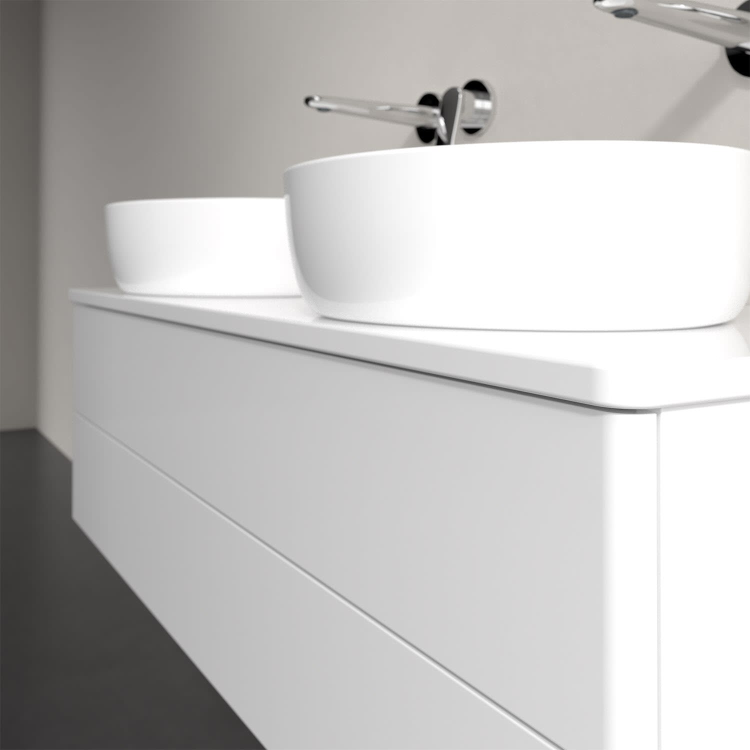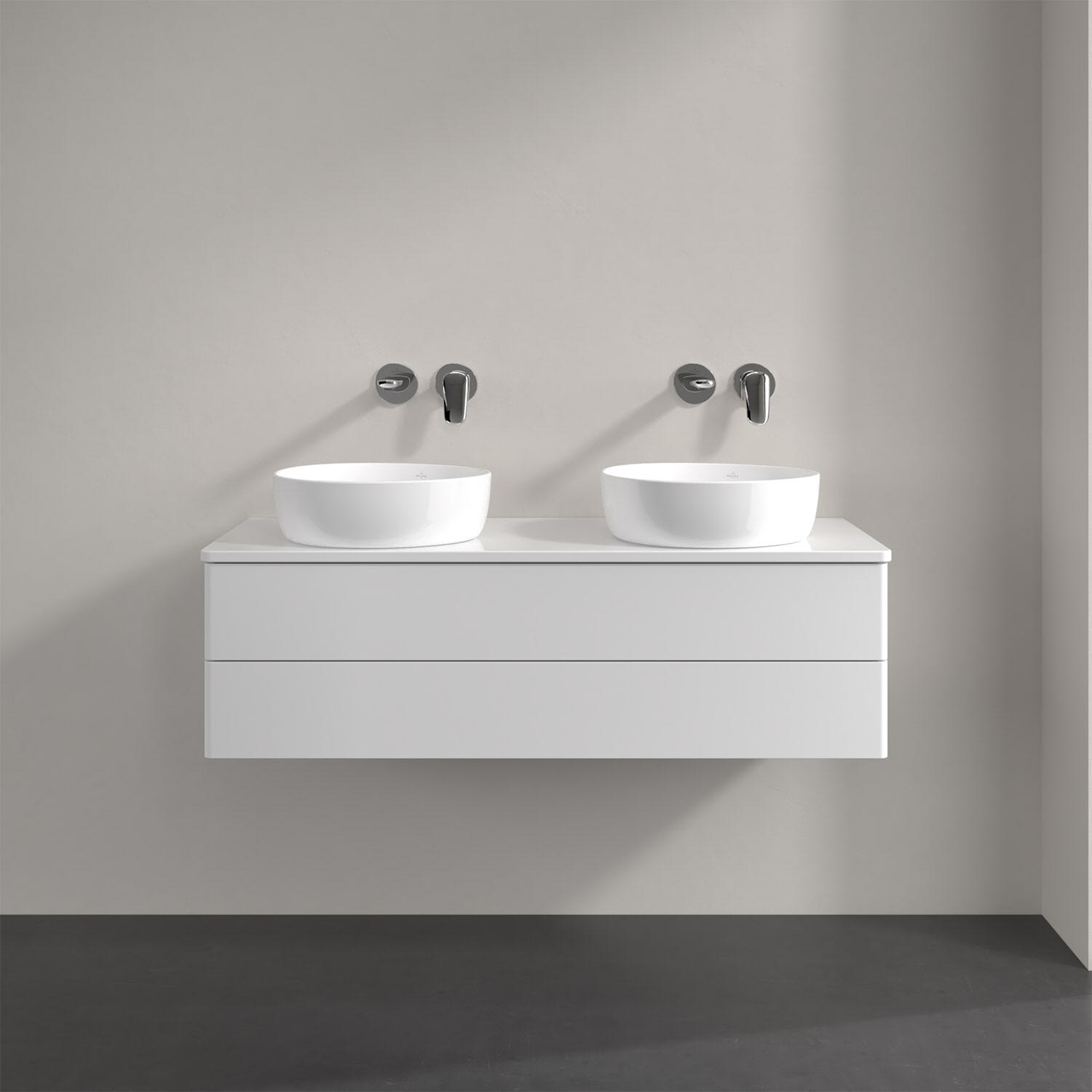 Der wandhängende Antao Waschtischunterschrank von Villeroy & Boch bietet nicht nur jede Menge Stauraum – er ist dank seines naturinspirierten Designs mit seinen abgerundeten Kanten auch noch besonders stilvoll und schafft eine gemütliche Atmosphäre im Badezimmer. Kombiniert mit zwei passenden Aufsatzwaschtischen also die ideale Wahl. Zwei geräumige Auszüge bieten viel Platz, um alles Notwendige zu verstauen und Ordnung zu halten. Öffnen lassen sie sich durch leichten Druck auf die grifflose Front. Dabei aktiviert sich übrigens die Auszugsbeleuchtung in angenehmem Warmweiß. Dank Vollauszug hat man immer alles im Blick und der Antirutschboden verhindert ein Umfallen oder Verrutschen der Gegenstände. Einfach clever! Für eine besonders leichte Pflege sorgt die mehrschichtig deckend lackierte Oberfläche.