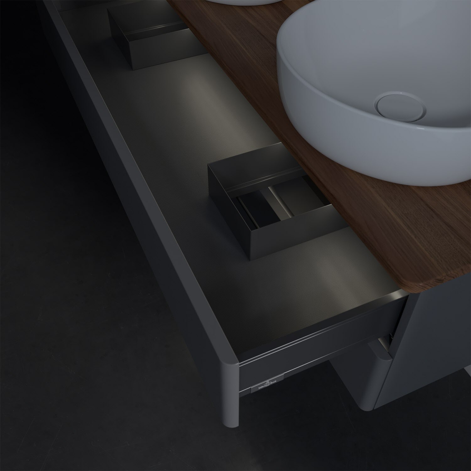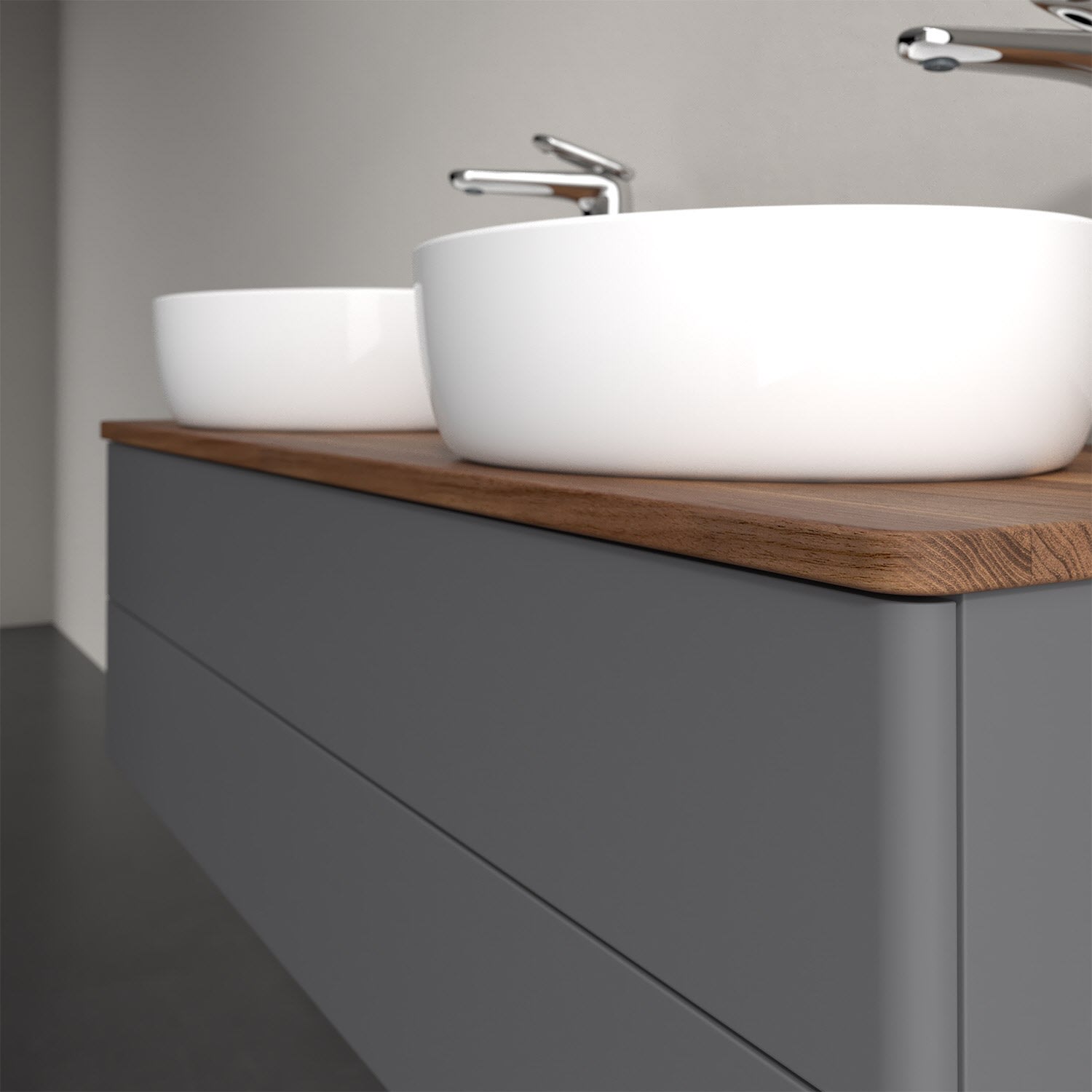 Der wandhängende Antao Waschtischunterschrank von Villeroy & Boch bietet nicht nur jede Menge Stauraum – er ist dank seines naturinspirierten Designs mit seinen abgerundeten Kanten auch noch besonders stilvoll und schafft eine gemütliche Atmosphäre im Badezimmer. Kombiniert mit zwei passenden Aufsatzwaschtischen also die ideale Wahl. Zwei geräumige Auszüge bieten viel Platz, um alles Notwendige zu verstauen und Ordnung zu halten. Öffnen lassen sie sich durch leichten Druck auf die grifflose Front. Dabei aktiviert sich übrigens die Auszugsbeleuchtung in angenehmem Warmweiß. Dank Vollauszug hat man immer alles im Blick und der Antirutschboden verhindert ein Umfallen oder Verrutschen der Gegenstände. Einfach clever! Für eine besonders leichte Pflege sorgt die mehrschichtig deckend lackierte Oberfläche. Bei der Ausführung in Massivholz wird dank des verarbeiteten Massivholzes jedes Möbel zu einem Unikat, das sich durch das lebendige Naturmaterial durch seine einzigartige Struktur und Maserung auszeichnet.