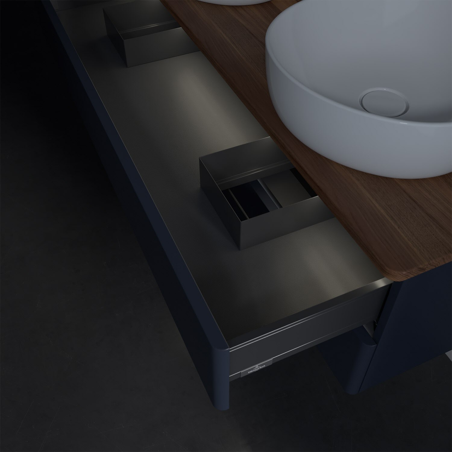 Der wandhängende Antao Waschtischunterschrank von Villeroy & Boch bietet nicht nur jede Menge Stauraum – er ist dank seines naturinspirierten Designs mit seinen abgerundeten Kanten auch noch besonders stilvoll und schafft eine gemütliche Atmosphäre im Badezimmer. Kombiniert mit zwei passenden Aufsatzwaschtischen also die ideale Wahl. Zwei geräumige Auszüge bieten viel Platz, um alles Notwendige zu verstauen und Ordnung zu halten. Öffnen lassen sie sich durch leichten Druck auf die grifflose Front. Dabei aktiviert sich übrigens die Auszugsbeleuchtung in angenehmem Warmweiß. Dank Vollauszug hat man immer alles im Blick und der Antirutschboden verhindert ein Umfallen oder Verrutschen der Gegenstände. Einfach clever! Für eine besonders leichte Pflege sorgt die mehrschichtig deckend lackierte Oberfläche. Bei der Ausführung in Massivholz wird dank des verarbeiteten Massivholzes jedes Möbel zu einem Unikat, das sich durch das lebendige Naturmaterial durch seine einzigartige Struktur und Maserung auszeichnet.