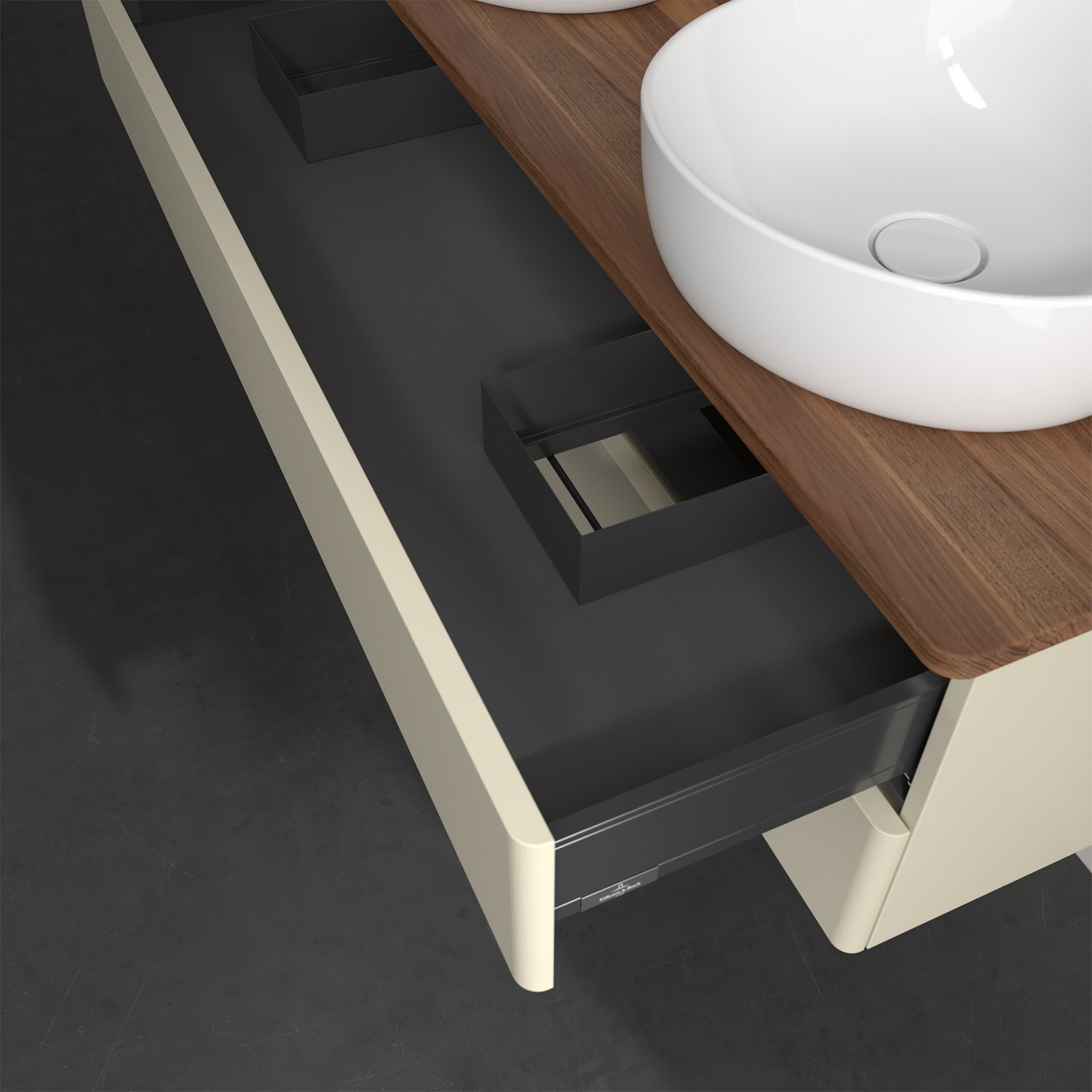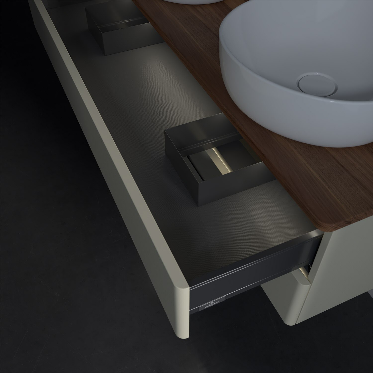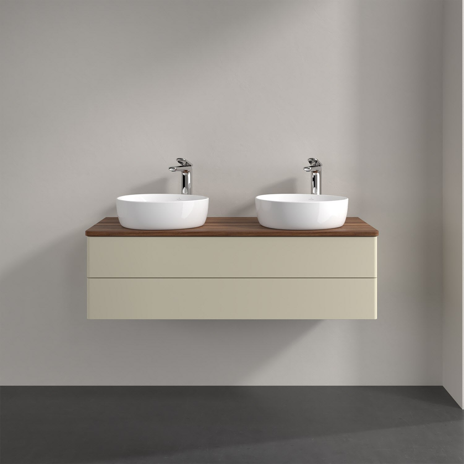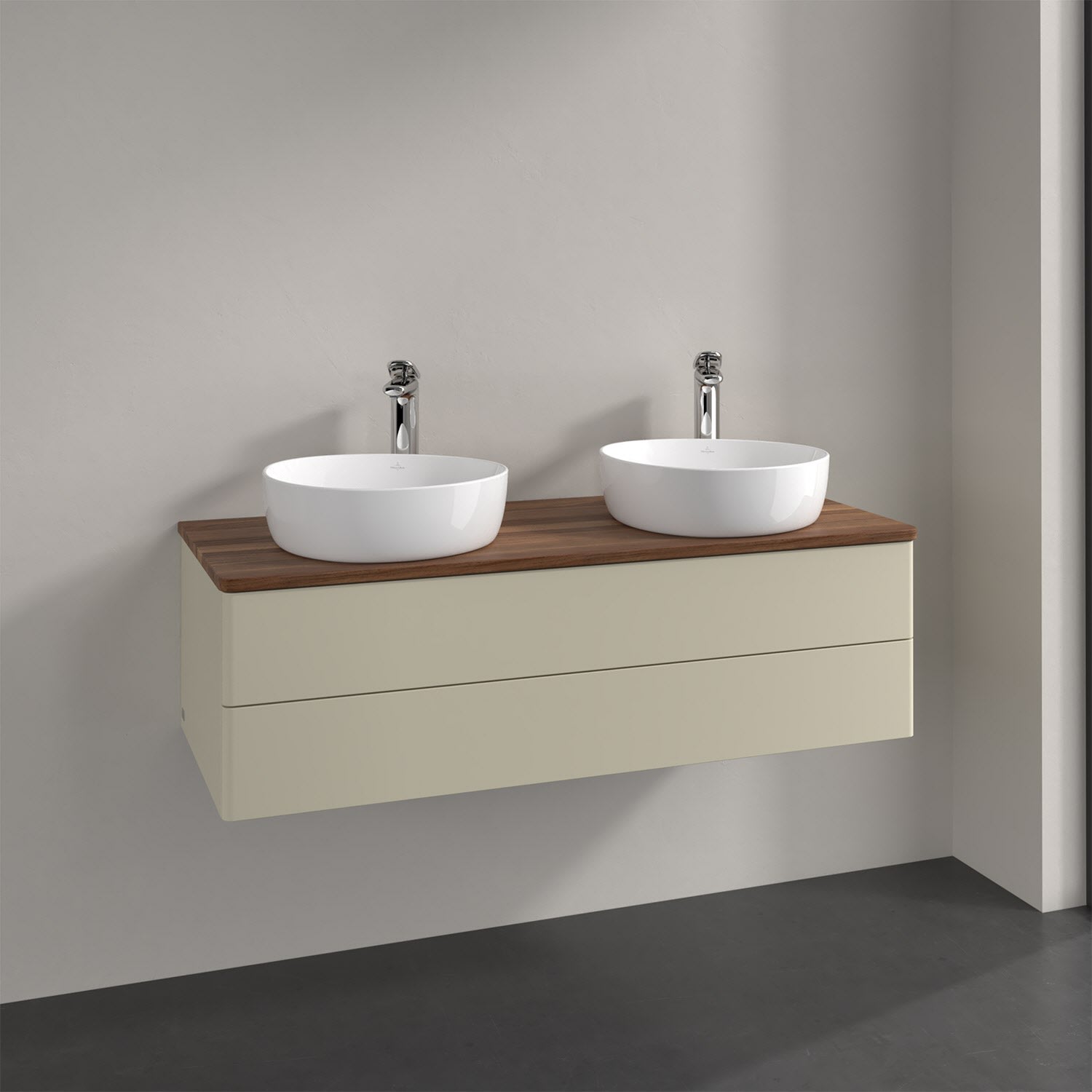 Der wandhängende Antao Waschtischunterschrank von Villeroy & Boch bietet nicht nur jede Menge Stauraum – er ist dank seines naturinspirierten Designs mit seinen abgerundeten Kanten auch noch besonders stilvoll und schafft eine gemütliche Atmosphäre im Badezimmer. Kombiniert mit zwei passenden Aufsatzwaschtischen also die ideale Wahl. Zwei geräumige Auszüge bieten viel Platz, um alles Notwendige zu verstauen und Ordnung zu halten. Öffnen lassen sie sich durch leichten Druck auf die grifflose Front. Dabei aktiviert sich übrigens die Auszugsbeleuchtung in angenehmem Warmweiß. Dank Vollauszug hat man immer alles im Blick und der Antirutschboden verhindert ein Umfallen oder Verrutschen der Gegenstände. Einfach clever! Für eine besonders leichte Pflege sorgt die mehrschichtig deckend lackierte Oberfläche. Bei der Ausführung in Massivholz wird dank des verarbeiteten Massivholzes jedes Möbel zu einem Unikat, das sich durch das lebendige Naturmaterial durch seine einzigartige Struktur und Maserung auszeichnet.