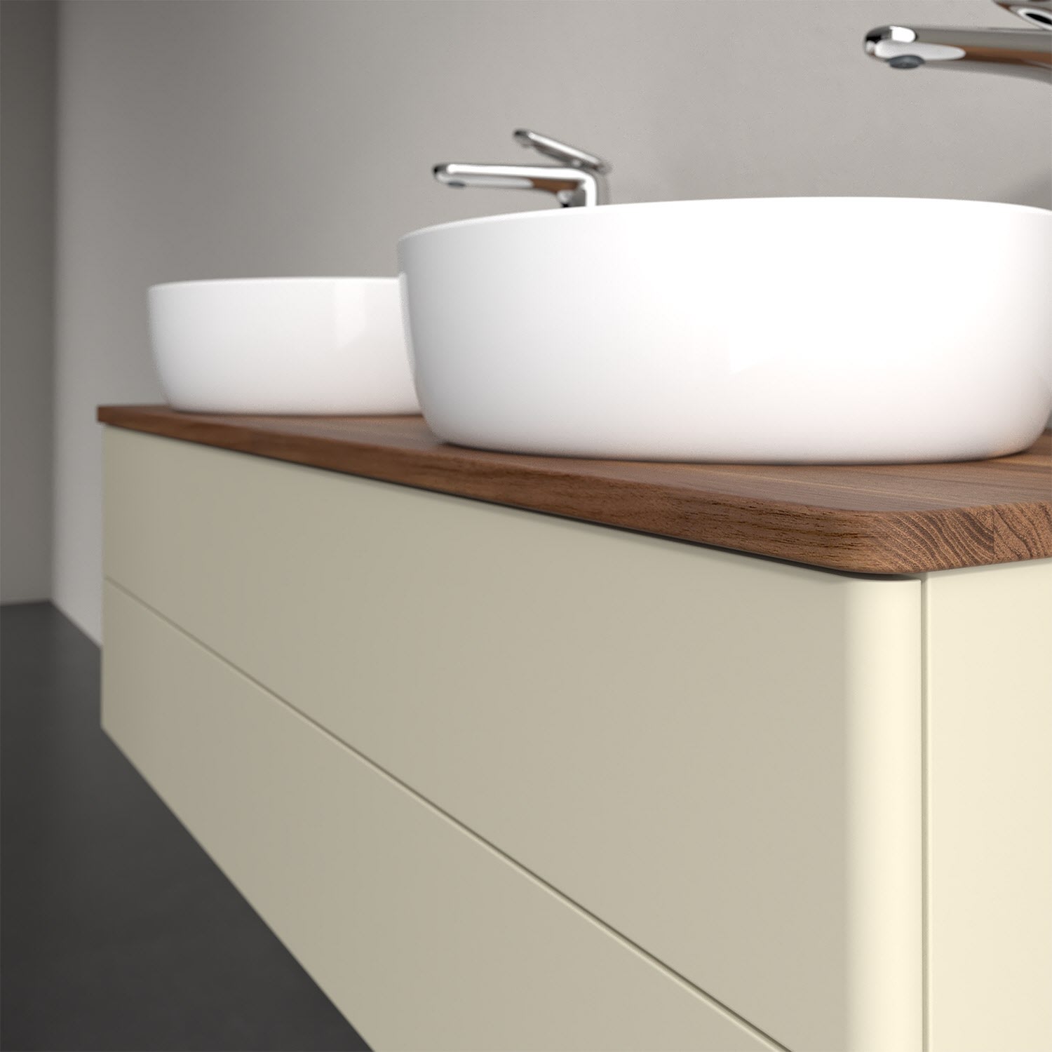 Für diesen Waschbeckenunterschrank stehen Ihnen Aufsatzwaschtische aus verschiedenen Serien zur Verfügung (siehe "Passliste" unter Downloads). Ein ausgewähltes Beispiel finden Sie im Zubehör. Den Waschtisch bitte separat mitbestellen.