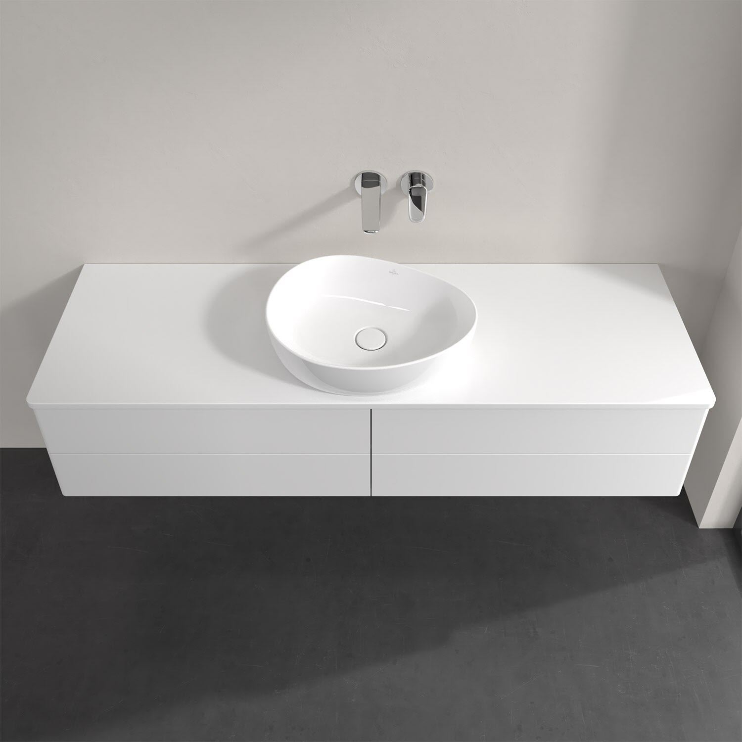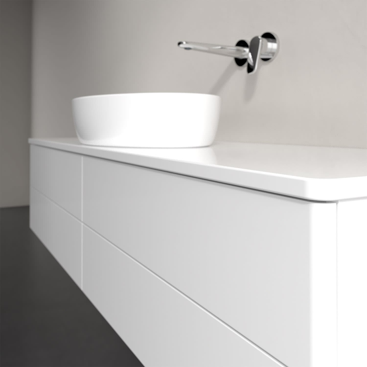Der wandhängende Antao Waschtischunterschrank bietet mit seinen vier Auszügen und seiner erstaunlichen Größe viel Platz zum Verstauen von Utensilien im Badezimmer. Dank des mittig platzierten Aufsatzwaschtischs gibt es seitlich weiteren Platz für Handtücher, Seifenspender & Co. auf der Waschtischplatte. Inspiriert von der Natur überzeugt der Unterschrank auch optisch mit sanfter Formsprache und abgerundete Kanten. Die grifflosen Auszüge sind mit der Push-to-Open Funktion ausgestattet und verfügen über einen Antirutschboden, damit Utensilien sicher verstaut werden können. Den Überblick behält man dank der warmweißen Auszugsbeleuchtung, die sich automatisch beim Öffnen einschaltet. Mit seiner Vollauszug- und Selbsteinzug-Funktion ist der Schrank praktisch und leicht zu bedienen. Qualität von Villeroy & Boch! Für eine besonders leichte Pflege sorgt die mehrschichtig deckend lackierte Oberfläche.