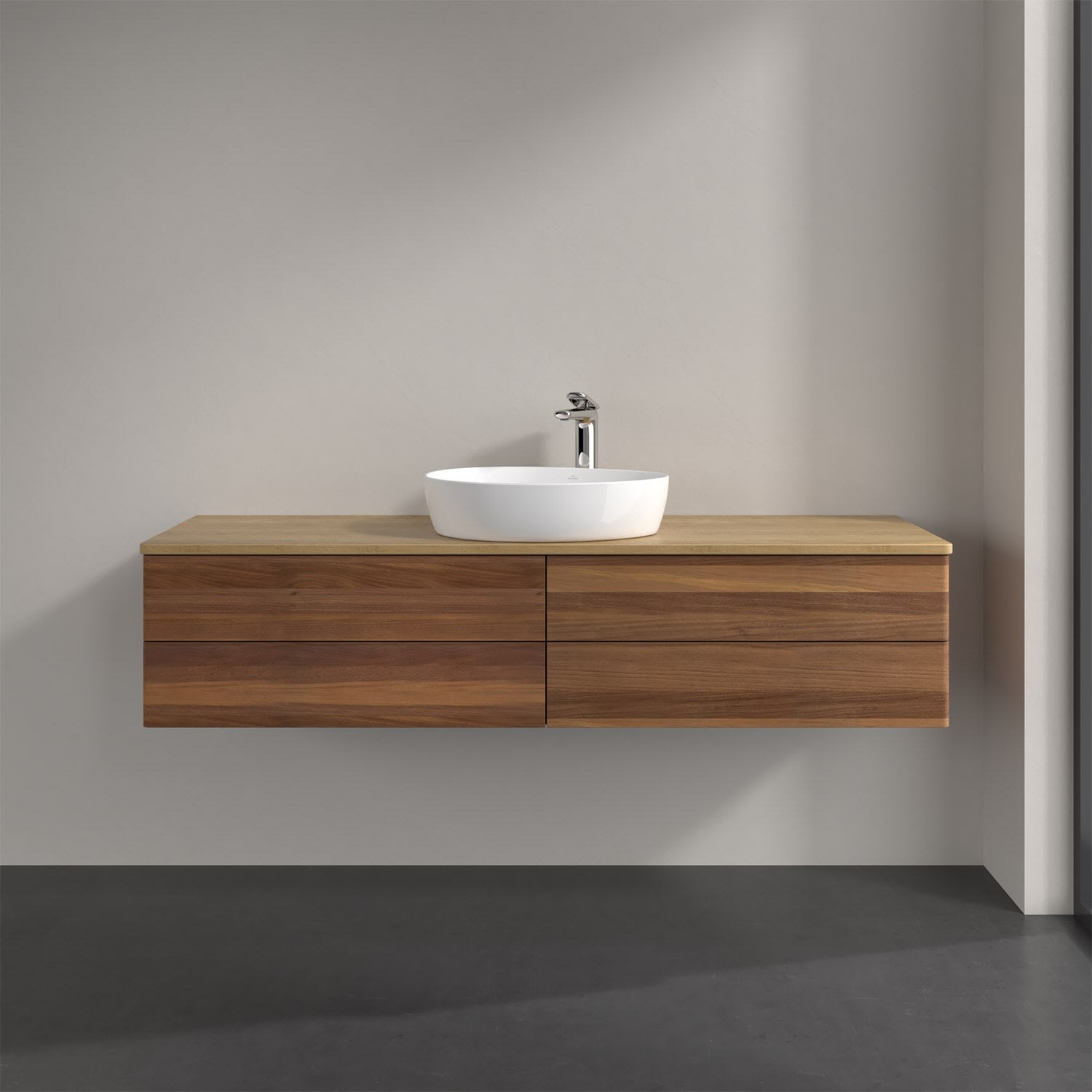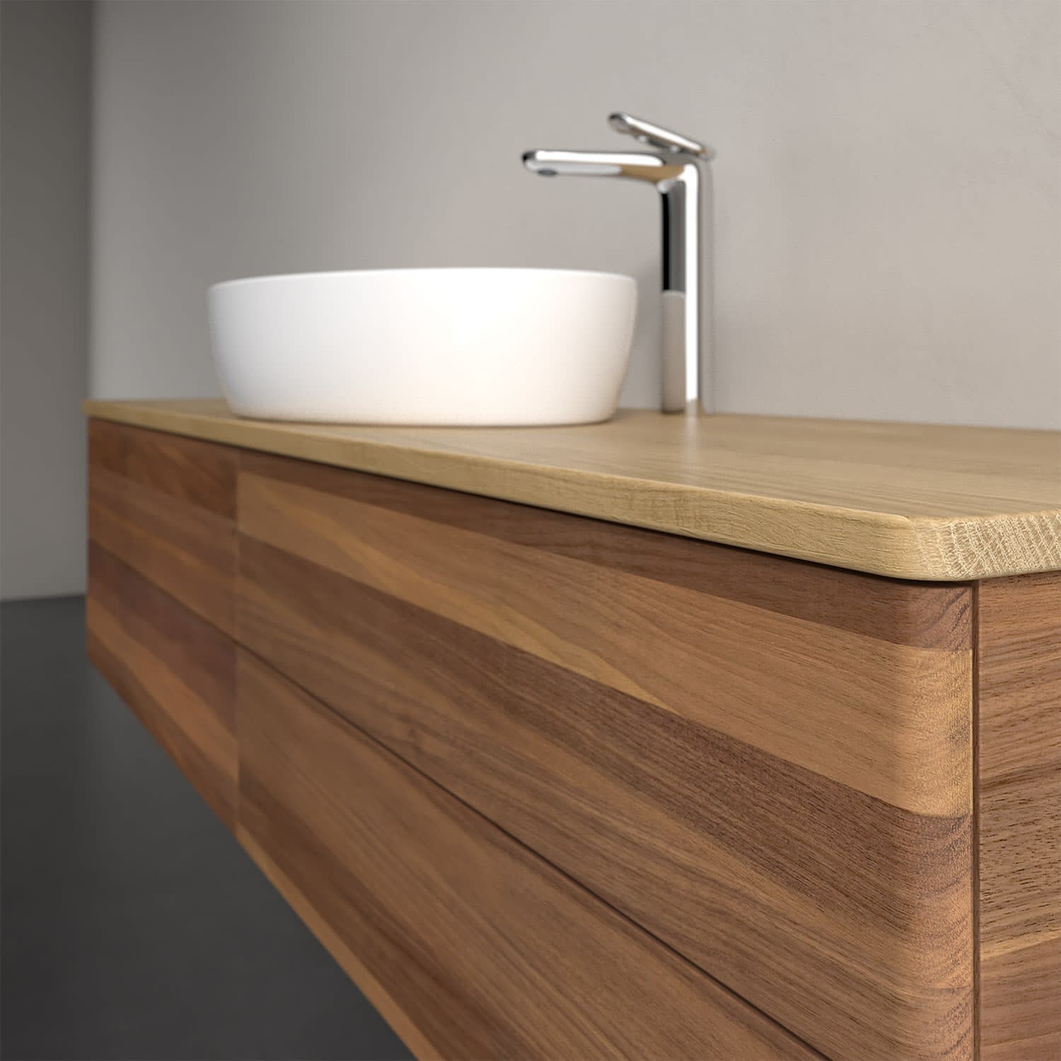 Der wandhängende Antao Waschtischunterschrank bietet mit seinen vier Auszügen und seiner erstaunlichen Größe viel Platz zum Verstauen von Utensilien im Badezimmer. Dank des mittig platzierten Aufsatzwaschtischs gibt es seitlich weiteren Platz für Handtücher, Seifenspender & Co. auf der Waschtischplatte. Inspiriert von der Natur überzeugt der Unterschrank auch optisch mit sanfter Formsprache und abgerundete Kanten. Die grifflosen Auszüge sind mit der Push-to-Open Funktion ausgestattet und verfügen über einen Antirutschboden, damit Utensilien sicher verstaut werden können. Den Überblick behält man dank der warmweißen Auszugsbeleuchtung, die sich automatisch beim Öffnen einschaltet. Mit seiner Vollauszug- und Selbsteinzug-Funktion ist der Schrank praktisch und leicht zu bedienen. Qualität von Villeroy & Boch! Für eine besonders leichte Pflege sorgt die mehrschichtig deckend lackierte Oberfläche. Bei der Ausführung in Massivholz wird dank des verarbeiteten Massivholzes jedes Möbel zu einem Unikat, das sich durch das lebendige Naturmaterial durch seine einzigartige Struktur und Maserung auszeichnet.