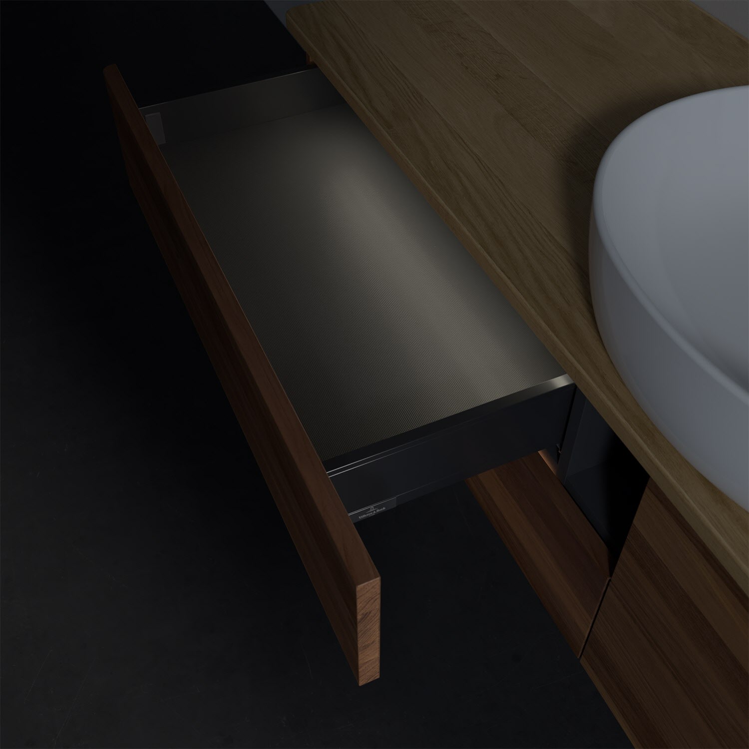 - in Schublade integrierte LED-Leiste mit warmweißem Licht zur Beleuchtung des Innenlebens