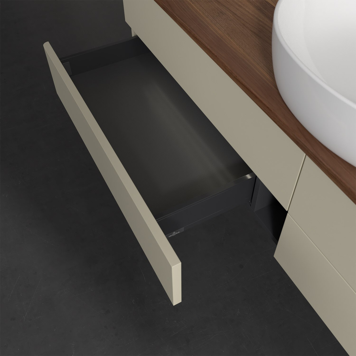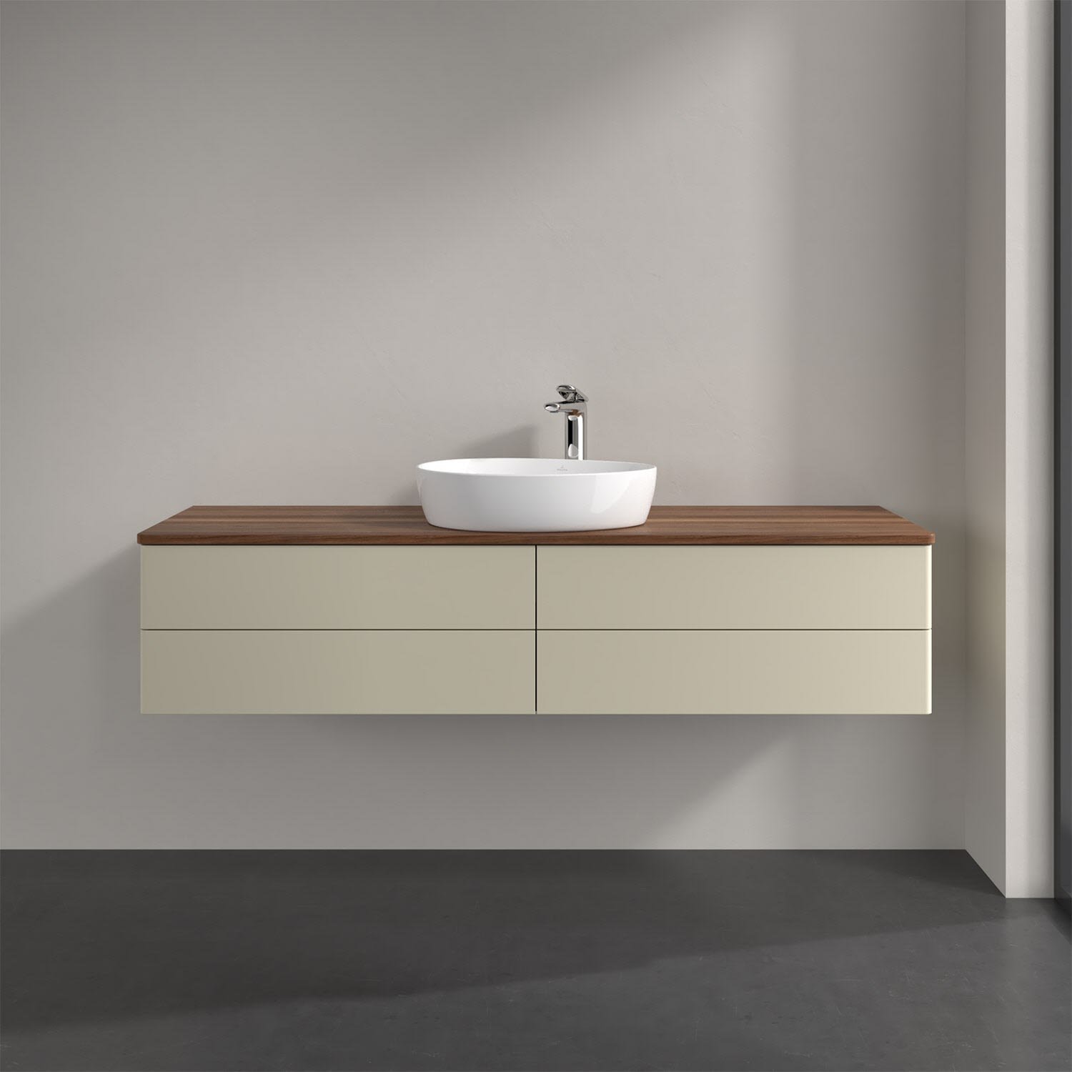 Der wandhängende Antao Waschtischunterschrank bietet mit seinen vier Auszügen und seiner erstaunlichen Größe viel Platz zum Verstauen von Utensilien im Badezimmer. Dank des mittig platzierten Aufsatzwaschtischs gibt es seitlich weiteren Platz für Handtücher, Seifenspender & Co. auf der Waschtischplatte. Inspiriert von der Natur überzeugt der Unterschrank auch optisch mit sanfter Formsprache und abgerundete Kanten. Die grifflosen Auszüge sind mit der Push-to-Open Funktion ausgestattet und verfügen über einen Antirutschboden, damit Utensilien sicher verstaut werden können. Den Überblick behält man dank der warmweißen Auszugsbeleuchtung, die sich automatisch beim Öffnen einschaltet. Mit seiner Vollauszug- und Selbsteinzug-Funktion ist der Schrank praktisch und leicht zu bedienen. Qualität von Villeroy & Boch! Für eine besonders leichte Pflege sorgt die mehrschichtig deckend lackierte Oberfläche. Bei der Ausführung in Massivholz wird dank des verarbeiteten Massivholzes jedes Möbel zu einem Unikat, das sich durch das lebendige Naturmaterial durch seine einzigartige Struktur und Maserung auszeichnet.