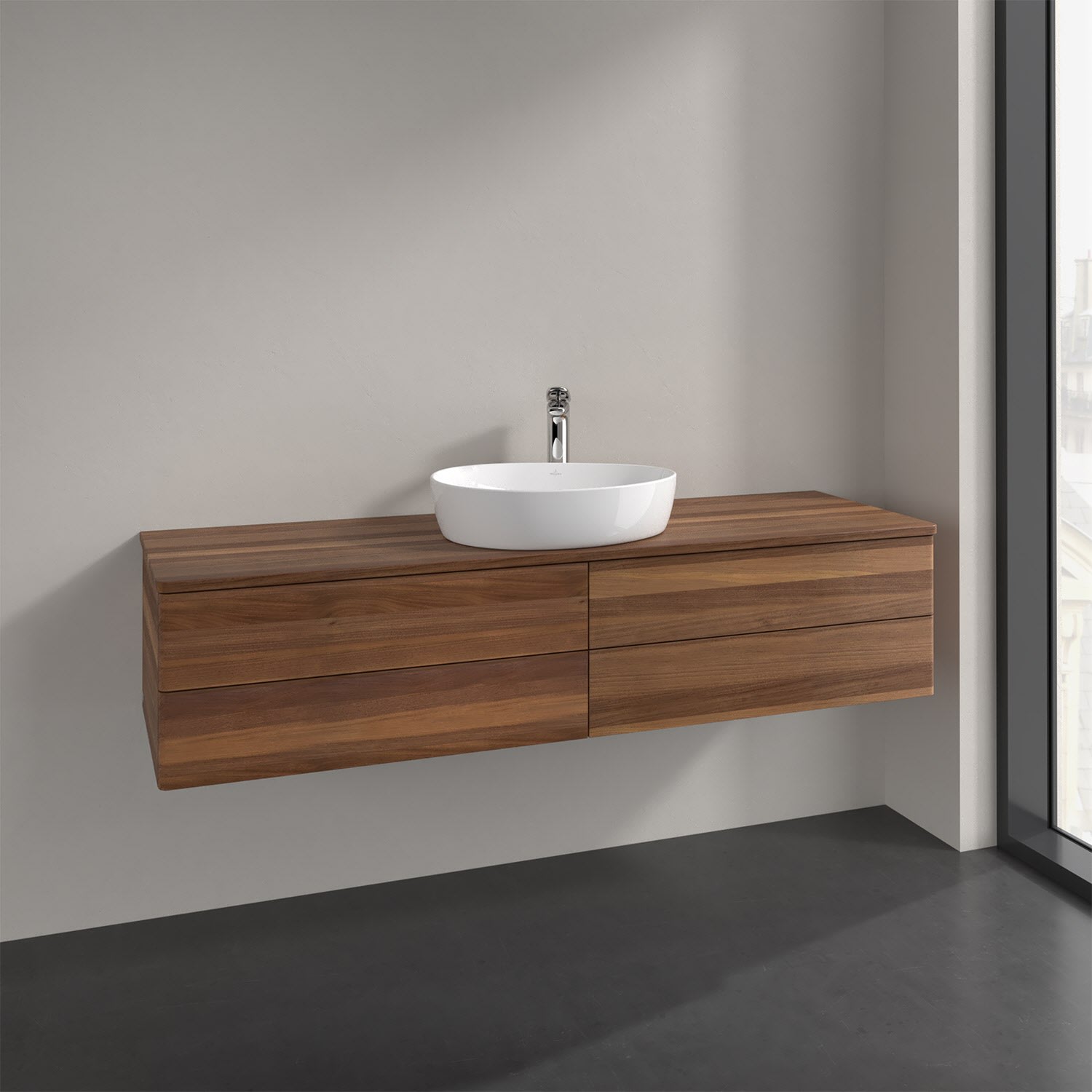 Der wandhängende Antao Waschtischunterschrank bietet mit seinen vier Auszügen und seiner erstaunlichen Größe viel Platz zum Verstauen von Utensilien im Badezimmer. Dank des mittig platzierten Aufsatzwaschtischs gibt es seitlich weiteren Platz für Handtücher, Seifenspender & Co. auf der Waschtischplatte. Inspiriert von der Natur überzeugt der Unterschrank auch optisch mit sanfter Formsprache und abgerundete Kanten. Die grifflosen Auszüge sind mit der Push-to-Open Funktion ausgestattet und verfügen über einen Antirutschboden, damit Utensilien sicher verstaut werden können. Den Überblick behält man dank der warmweißen Auszugsbeleuchtung, die sich automatisch beim Öffnen einschaltet. Mit seiner Vollauszug- und Selbsteinzug-Funktion ist der Schrank praktisch und leicht zu bedienen. Qualität von Villeroy & Boch! Für eine besonders leichte Pflege sorgt die mehrschichtig deckend lackierte Oberfläche. Bei der Ausführung in Massivholz wird dank des verarbeiteten Massivholzes jedes Möbel zu einem Unikat, das sich durch das lebendige Naturmaterial durch seine einzigartige Struktur und Maserung auszeichnet.