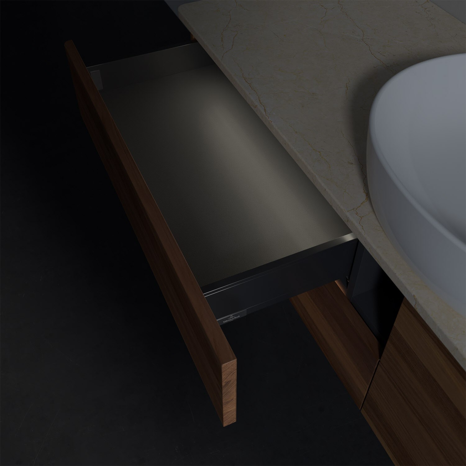 Der wandhängende Antao Waschtischunterschrank bietet mit seinen vier Auszügen und seiner erstaunlichen Größe viel Platz zum Verstauen von Utensilien im Badezimmer. Dank des mittig platzierten Aufsatzwaschtischs gibt es seitlich weiteren Platz für Handtücher, Seifenspender & Co. auf der Waschtischplatte. Inspiriert von der Natur überzeugt der Unterschrank auch optisch mit sanfter Formsprache und abgerundete Kanten. Die grifflosen Auszüge sind mit der Push-to-Open Funktion ausgestattet und verfügen über einen Antirutschboden, damit Utensilien sicher verstaut werden können. Den Überblick behält man dank der warmweißen Auszugsbeleuchtung, die sich automatisch beim Öffnen einschaltet. Mit seiner Vollauszug- und Selbsteinzug-Funktion ist der Schrank praktisch und leicht zu bedienen. Qualität von Villeroy & Boch! Für eine besonders leichte Pflege sorgt die mehrschichtig deckend lackierte Oberfläche. Bei der Ausführung in Massivholz wird dank des verarbeiteten Massivholzes jedes Möbel zu einem Unikat, das sich durch das lebendige Naturmaterial durch seine einzigartige Struktur und Maserung auszeichnet.