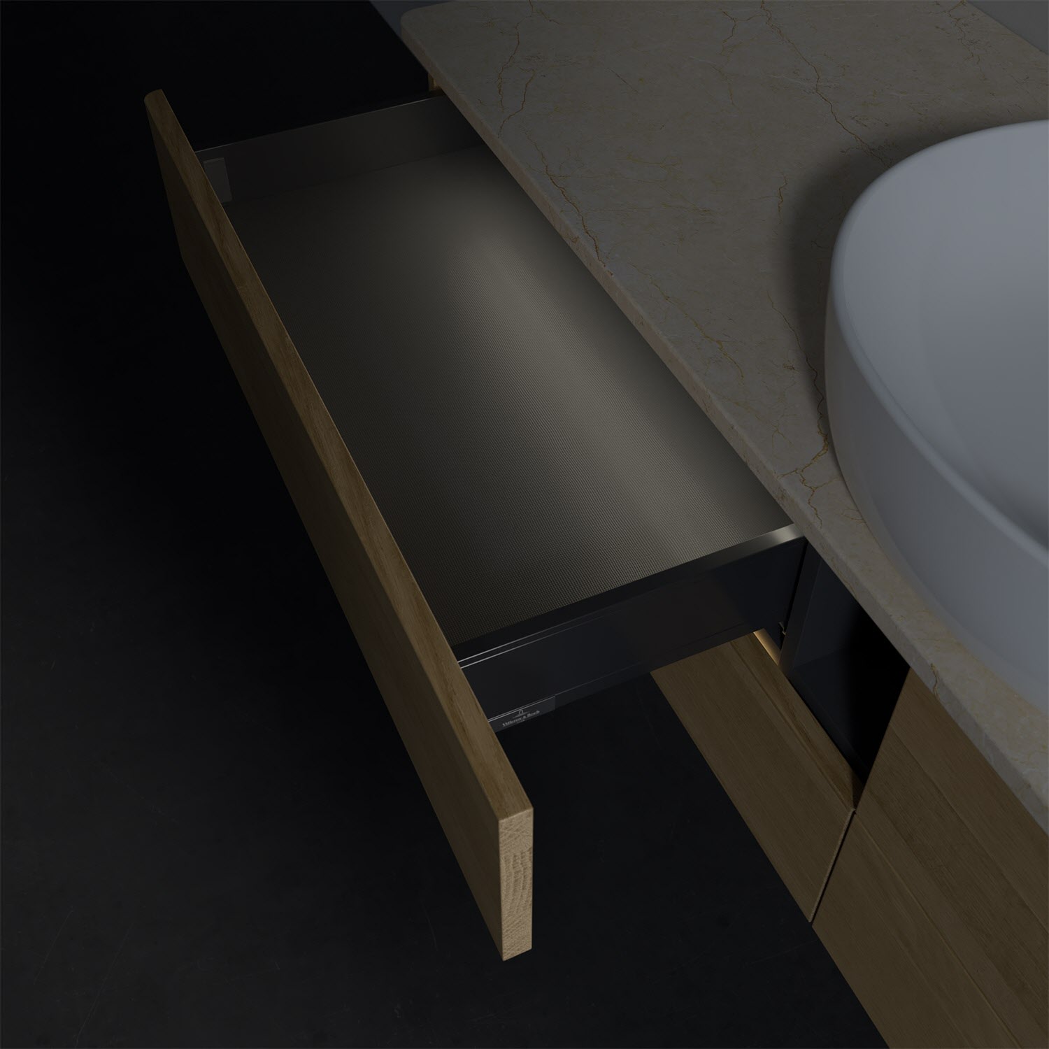 - in Schublade integrierte LED-Leiste mit warmweißem Licht zur Beleuchtung des Innenlebens