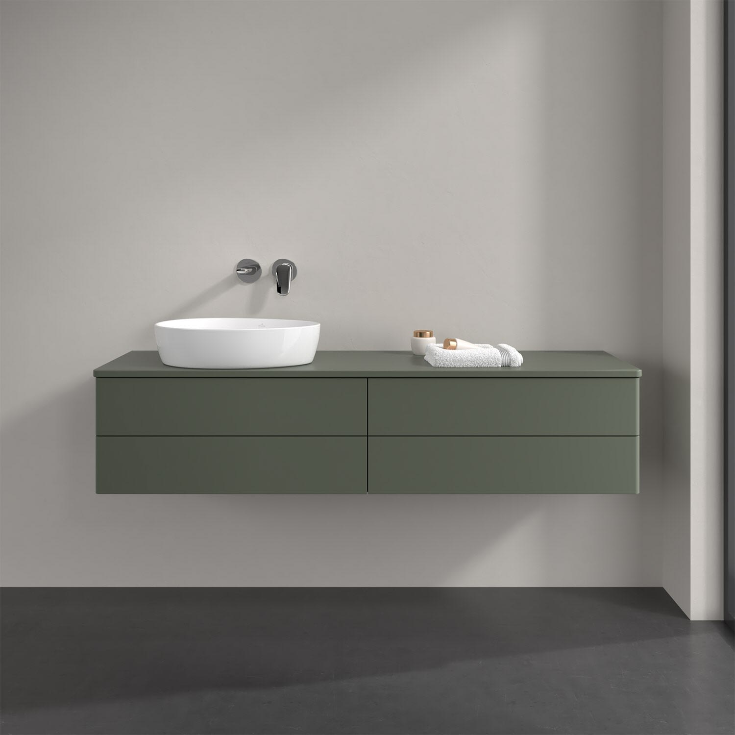 Für diesen Waschbeckenunterschrank stehen Ihnen Aufsatzwaschtische aus verschiedenen Serien zur Verfügung (siehe "Passliste" unter Downloads). Ein ausgewähltes Beispiel finden Sie im Zubehör. Den Waschtisch bitte separat mitbestellen.
