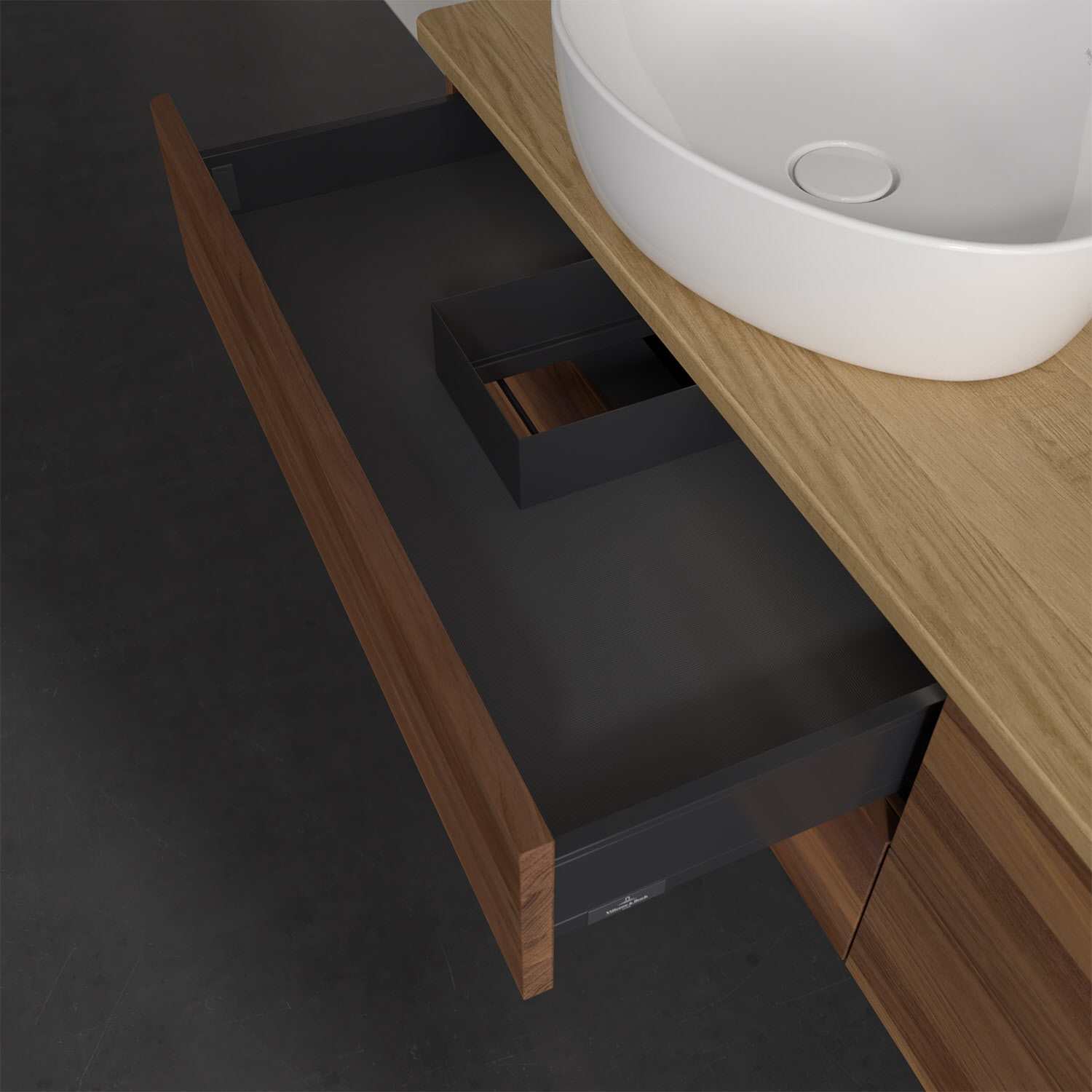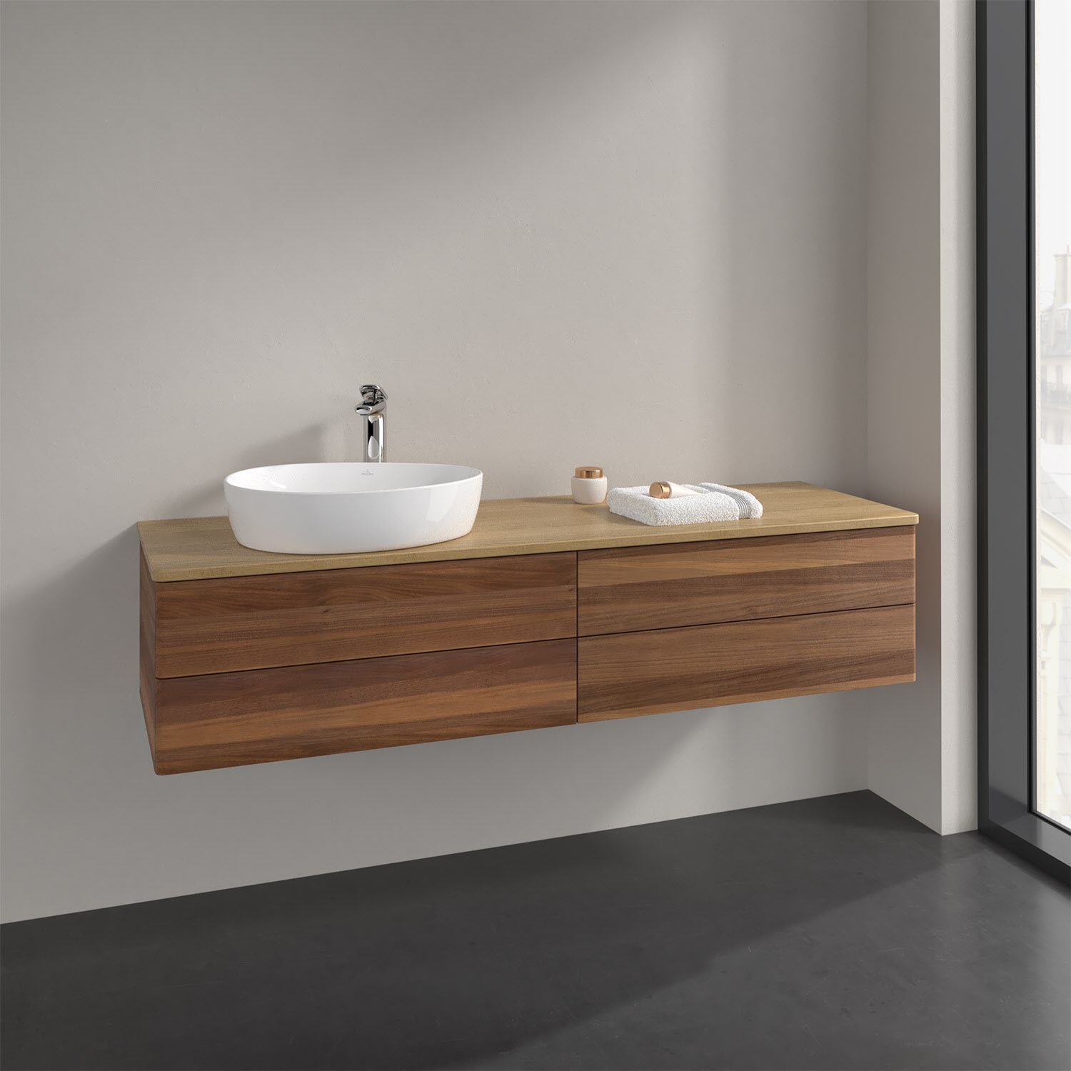 Der wandhängende Antao Waschtischunterschrank bietet mit seinen vier Auszügen und seiner erstaunlichen Größe viel Platz zum Verstauen von Utensilien im Badezimmer. Dank des seitlich platzierten Aufsatzwaschtischs gibt es daneben weiteren Platz für Handtücher, Seifenspender & Co. auf der Waschtischplatte. Inspiriert von der Natur überzeugt der Unterschrank auch optisch mit sanfter Formsprache und abgerundete Kanten. Die grifflosen Auszüge sind mit der Push-to-Open Funktion ausgestattet und verfügen über einen Antirutschboden, damit Utensilien sicher verstaut werden können. Den Überblick behält man dank der warmweißen Auszugsbeleuchtung, die sich automatisch beim Öffnen einschaltet. Mit seiner Vollauszug- und Selbsteinzug-Funktion ist der Schrank praktisch und leicht zu bedienen. Qualität von Villeroy & Boch! Für eine besonders leichte Pflege sorgt die mehrschichtig deckend lackierte Oberfläche. Bei der Ausführung in Massivholz wird dank des verarbeiteten Massivholzes jedes Möbel zu einem Unikat, das sich durch das lebendige Naturmaterial durch seine einzigartige Struktur und Maserung auszeichnet.