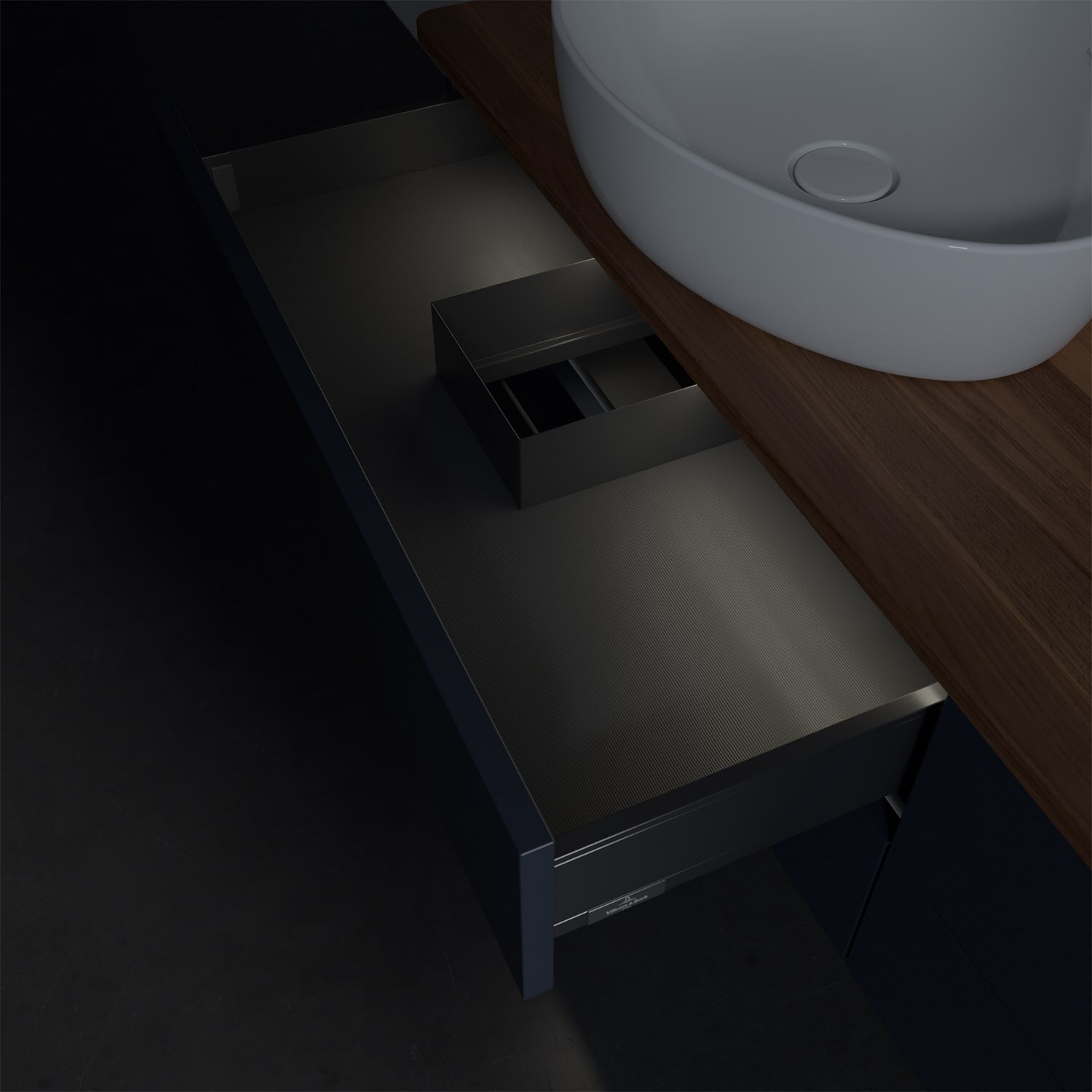 Der wandhängende Antao Waschtischunterschrank bietet mit seinen vier Auszügen und seiner erstaunlichen Größe viel Platz zum Verstauen von Utensilien im Badezimmer. Dank des seitlich platzierten Aufsatzwaschtischs gibt es daneben weiteren Platz für Handtücher, Seifenspender & Co. auf der Waschtischplatte. Inspiriert von der Natur überzeugt der Unterschrank auch optisch mit sanfter Formsprache und abgerundete Kanten. Die grifflosen Auszüge sind mit der Push-to-Open Funktion ausgestattet und verfügen über einen Antirutschboden, damit Utensilien sicher verstaut werden können. Den Überblick behält man dank der warmweißen Auszugsbeleuchtung, die sich automatisch beim Öffnen einschaltet. Mit seiner Vollauszug- und Selbsteinzug-Funktion ist der Schrank praktisch und leicht zu bedienen. Qualität von Villeroy & Boch! Für eine besonders leichte Pflege sorgt die mehrschichtig deckend lackierte Oberfläche. Bei der Ausführung in Massivholz wird dank des verarbeiteten Massivholzes jedes Möbel zu einem Unikat, das sich durch das lebendige Naturmaterial durch seine einzigartige Struktur und Maserung auszeichnet.