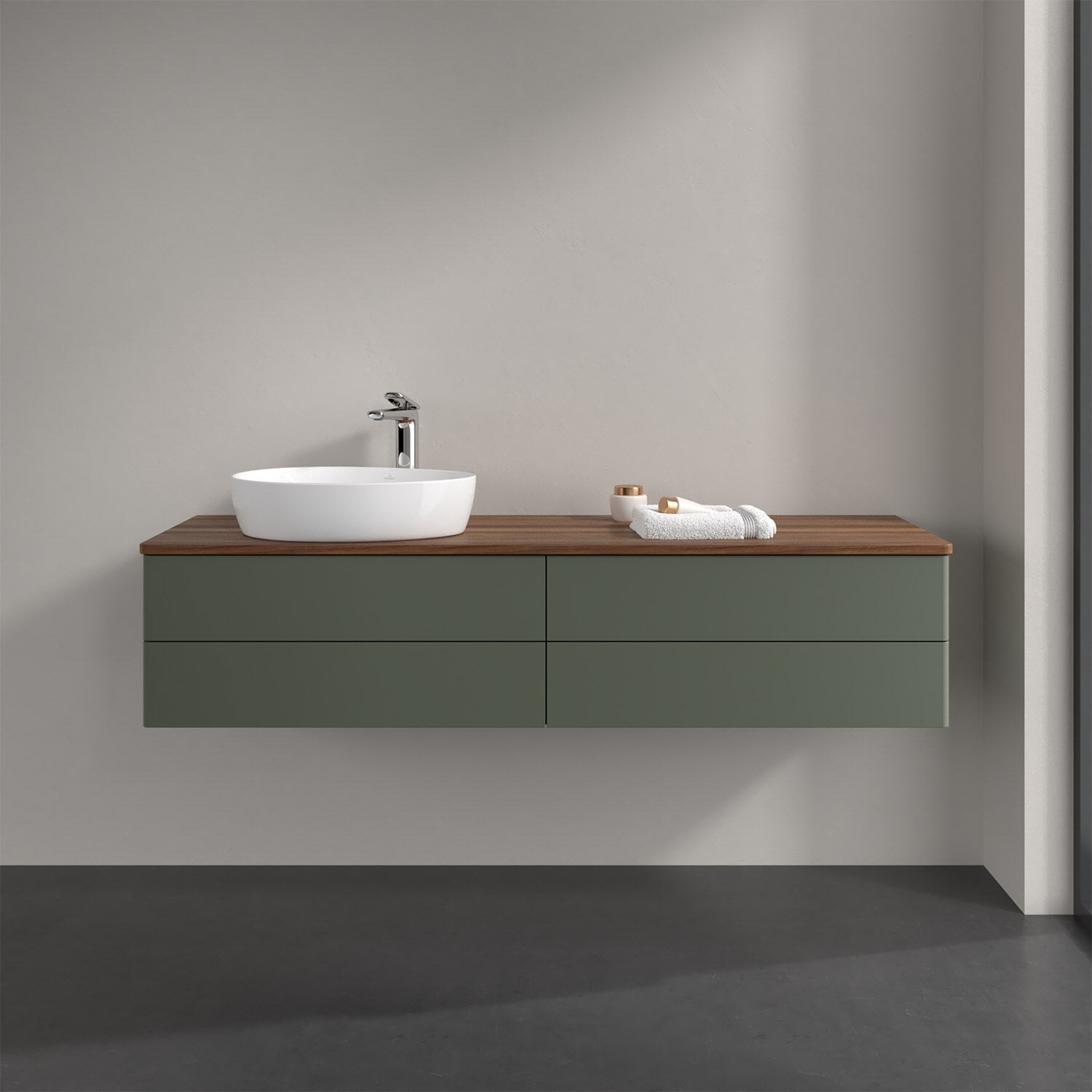 Der wandhängende Antao Waschtischunterschrank bietet mit seinen vier Auszügen und seiner erstaunlichen Größe viel Platz zum Verstauen von Utensilien im Badezimmer. Dank des seitlich platzierten Aufsatzwaschtischs gibt es daneben weiteren Platz für Handtücher, Seifenspender & Co. auf der Waschtischplatte. Inspiriert von der Natur überzeugt der Unterschrank auch optisch mit sanfter Formsprache und abgerundete Kanten. Die grifflosen Auszüge sind mit der Push-to-Open Funktion ausgestattet und verfügen über einen Antirutschboden, damit Utensilien sicher verstaut werden können. Den Überblick behält man dank der warmweißen Auszugsbeleuchtung, die sich automatisch beim Öffnen einschaltet. Mit seiner Vollauszug- und Selbsteinzug-Funktion ist der Schrank praktisch und leicht zu bedienen. Qualität von Villeroy & Boch! Für eine besonders leichte Pflege sorgt die mehrschichtig deckend lackierte Oberfläche. Bei der Ausführung in Massivholz wird dank des verarbeiteten Massivholzes jedes Möbel zu einem Unikat, das sich durch das lebendige Naturmaterial durch seine einzigartige Struktur und Maserung auszeichnet.