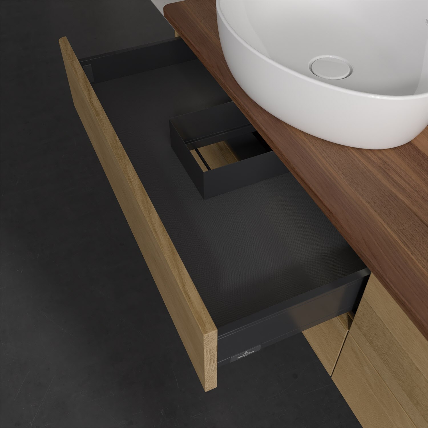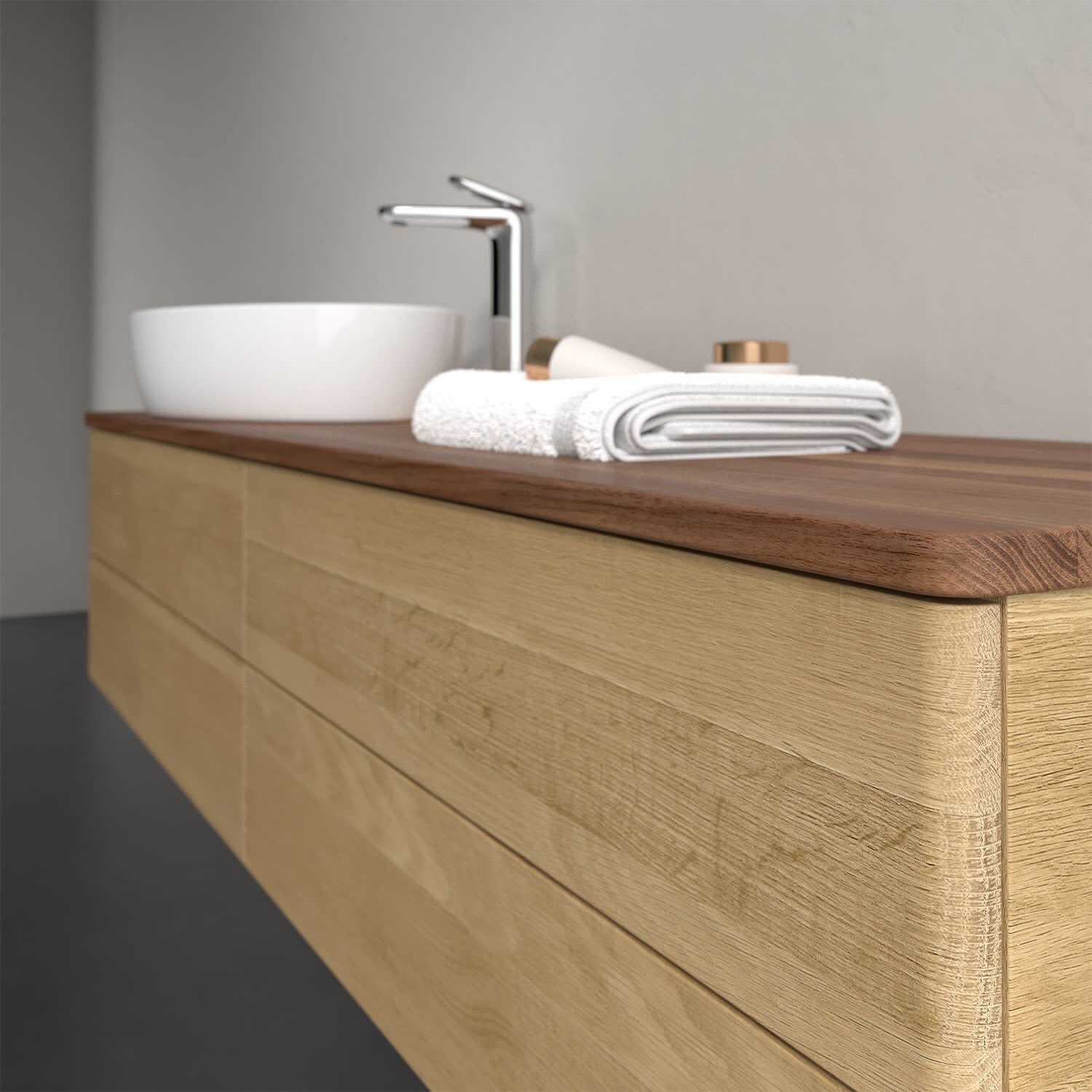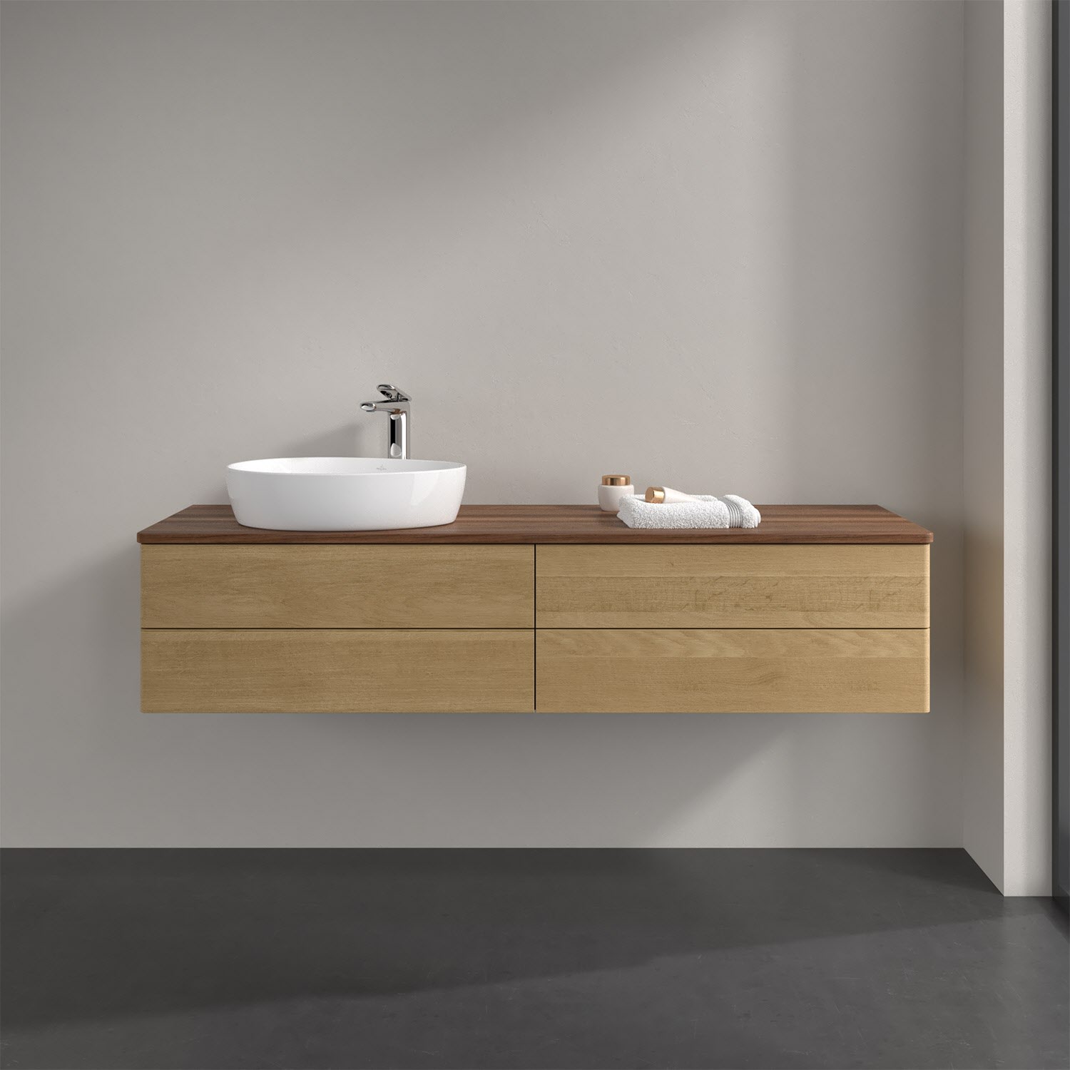Der wandhängende Antao Waschtischunterschrank bietet mit seinen vier Auszügen und seiner erstaunlichen Größe viel Platz zum Verstauen von Utensilien im Badezimmer. Dank des seitlich platzierten Aufsatzwaschtischs gibt es daneben weiteren Platz für Handtücher, Seifenspender & Co. auf der Waschtischplatte. Inspiriert von der Natur überzeugt der Unterschrank auch optisch mit sanfter Formsprache und abgerundete Kanten. Die grifflosen Auszüge sind mit der Push-to-Open Funktion ausgestattet und verfügen über einen Antirutschboden, damit Utensilien sicher verstaut werden können. Den Überblick behält man dank der warmweißen Auszugsbeleuchtung, die sich automatisch beim Öffnen einschaltet. Mit seiner Vollauszug- und Selbsteinzug-Funktion ist der Schrank praktisch und leicht zu bedienen. Qualität von Villeroy & Boch! Für eine besonders leichte Pflege sorgt die mehrschichtig deckend lackierte Oberfläche. Bei der Ausführung in Massivholz wird dank des verarbeiteten Massivholzes jedes Möbel zu einem Unikat, das sich durch das lebendige Naturmaterial durch seine einzigartige Struktur und Maserung auszeichnet.