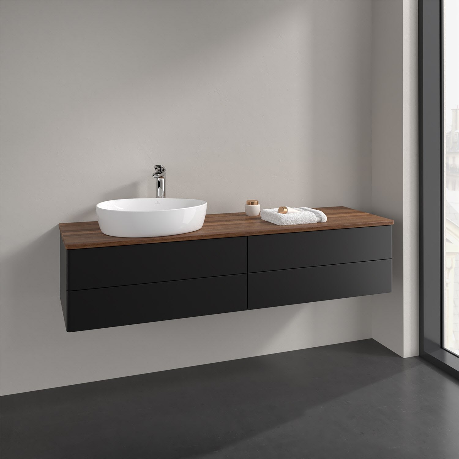 Der wandhängende Antao Waschtischunterschrank bietet mit seinen vier Auszügen und seiner erstaunlichen Größe viel Platz zum Verstauen von Utensilien im Badezimmer. Dank des seitlich platzierten Aufsatzwaschtischs gibt es daneben weiteren Platz für Handtücher, Seifenspender & Co. auf der Waschtischplatte. Inspiriert von der Natur überzeugt der Unterschrank auch optisch mit sanfter Formsprache und abgerundete Kanten. Die grifflosen Auszüge sind mit der Push-to-Open Funktion ausgestattet und verfügen über einen Antirutschboden, damit Utensilien sicher verstaut werden können. Den Überblick behält man dank der warmweißen Auszugsbeleuchtung, die sich automatisch beim Öffnen einschaltet. Mit seiner Vollauszug- und Selbsteinzug-Funktion ist der Schrank praktisch und leicht zu bedienen. Qualität von Villeroy & Boch! Für eine besonders leichte Pflege sorgt die mehrschichtig deckend lackierte Oberfläche. Bei der Ausführung in Massivholz wird dank des verarbeiteten Massivholzes jedes Möbel zu einem Unikat, das sich durch das lebendige Naturmaterial durch seine einzigartige Struktur und Maserung auszeichnet.