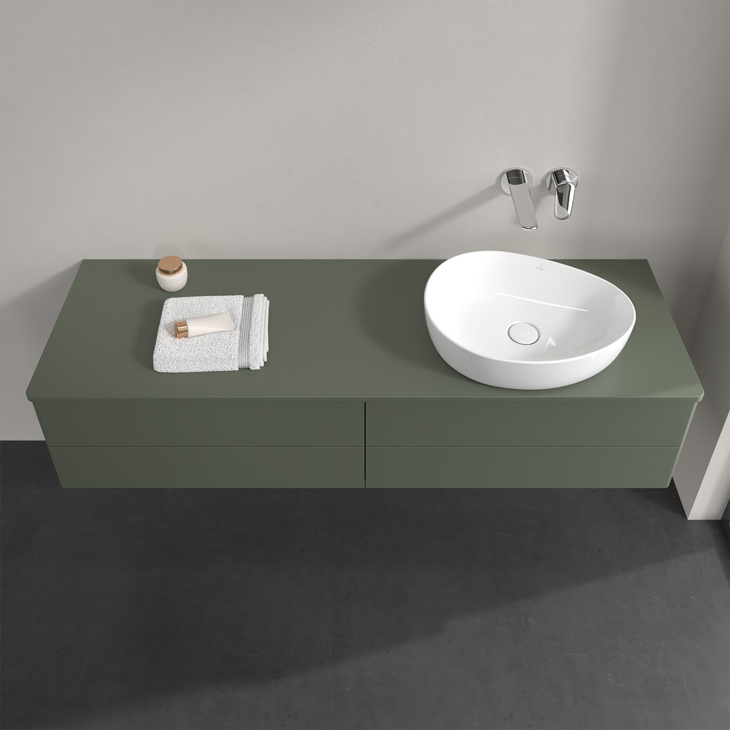 Für diesen Waschbeckenunterschrank stehen Ihnen Aufsatzwaschtische aus verschiedenen Serien zur Verfügung (siehe "Passliste" unter Downloads). Ein ausgewähltes Beispiel finden Sie im Zubehör. Den Waschtisch bitte separat mitbestellen.