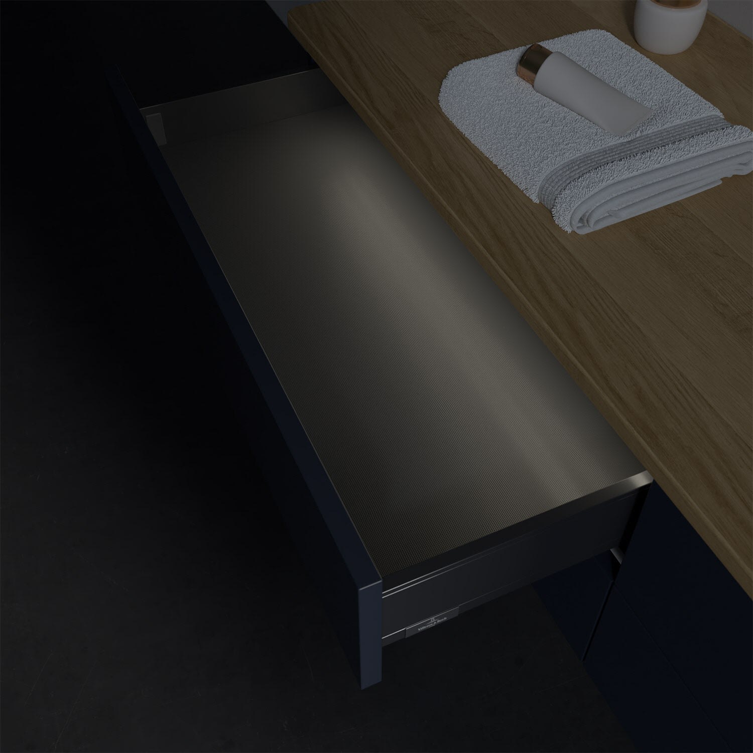 - in Schublade integrierte LED-Leiste mit warmweißem Licht zur Beleuchtung des Innenlebens