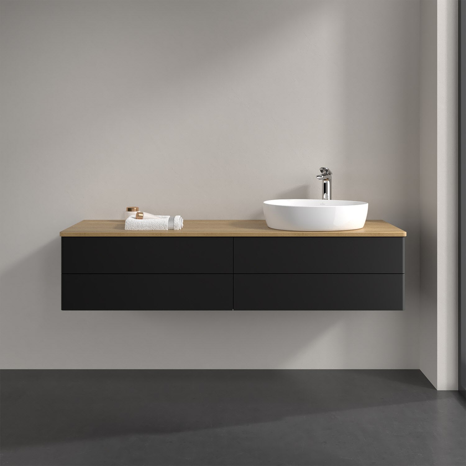 Der wandhängende Antao Waschtischunterschrank bietet mit seinen vier Auszügen und seiner erstaunlichen Größe viel Platz zum Verstauen von Utensilien im Badezimmer. Dank des seitlich platzierten Aufsatzwaschtischs gibt es daneben weiteren Platz für Handtücher, Seifenspender & Co. auf der Waschtischplatte. Inspiriert von der Natur überzeugt der Unterschrank auch optisch mit sanfter Formsprache und abgerundete Kanten. Die grifflosen Auszüge sind mit der Push-to-Open Funktion ausgestattet und verfügen über einen Antirutschboden, damit Utensilien sicher verstaut werden können. Den Überblick behält man dank der warmweißen Auszugsbeleuchtung, die sich automatisch beim Öffnen einschaltet. Mit seiner Vollauszug- und Selbsteinzug-Funktion ist der Schrank praktisch und leicht zu bedienen. Qualität von Villeroy & Boch! Für eine besonders leichte Pflege sorgt die mehrschichtig deckend lackierte Oberfläche. Bei der Ausführung in Massivholz wird dank des verarbeiteten Massivholzes jedes Möbel zu einem Unikat, das sich durch das lebendige Naturmaterial durch seine einzigartige Struktur und Maserung auszeichnet.
