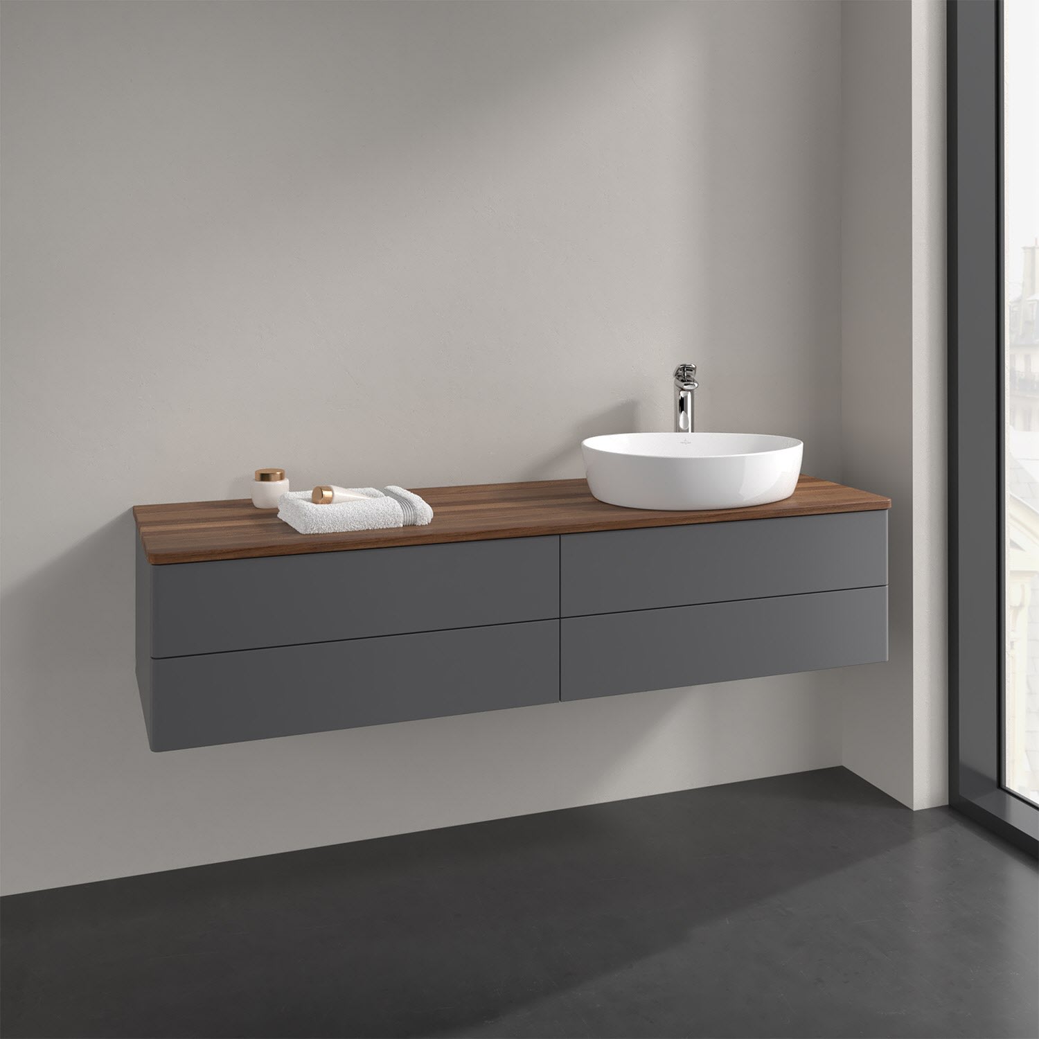 Der wandhängende Antao Waschtischunterschrank bietet mit seinen vier Auszügen und seiner erstaunlichen Größe viel Platz zum Verstauen von Utensilien im Badezimmer. Dank des seitlich platzierten Aufsatzwaschtischs gibt es daneben weiteren Platz für Handtücher, Seifenspender & Co. auf der Waschtischplatte. Inspiriert von der Natur überzeugt der Unterschrank auch optisch mit sanfter Formsprache und abgerundete Kanten. Die grifflosen Auszüge sind mit der Push-to-Open Funktion ausgestattet und verfügen über einen Antirutschboden, damit Utensilien sicher verstaut werden können. Den Überblick behält man dank der warmweißen Auszugsbeleuchtung, die sich automatisch beim Öffnen einschaltet. Mit seiner Vollauszug- und Selbsteinzug-Funktion ist der Schrank praktisch und leicht zu bedienen. Qualität von Villeroy & Boch! Für eine besonders leichte Pflege sorgt die mehrschichtig deckend lackierte Oberfläche. Bei der Ausführung in Massivholz wird dank des verarbeiteten Massivholzes jedes Möbel zu einem Unikat, das sich durch das lebendige Naturmaterial durch seine einzigartige Struktur und Maserung auszeichnet.