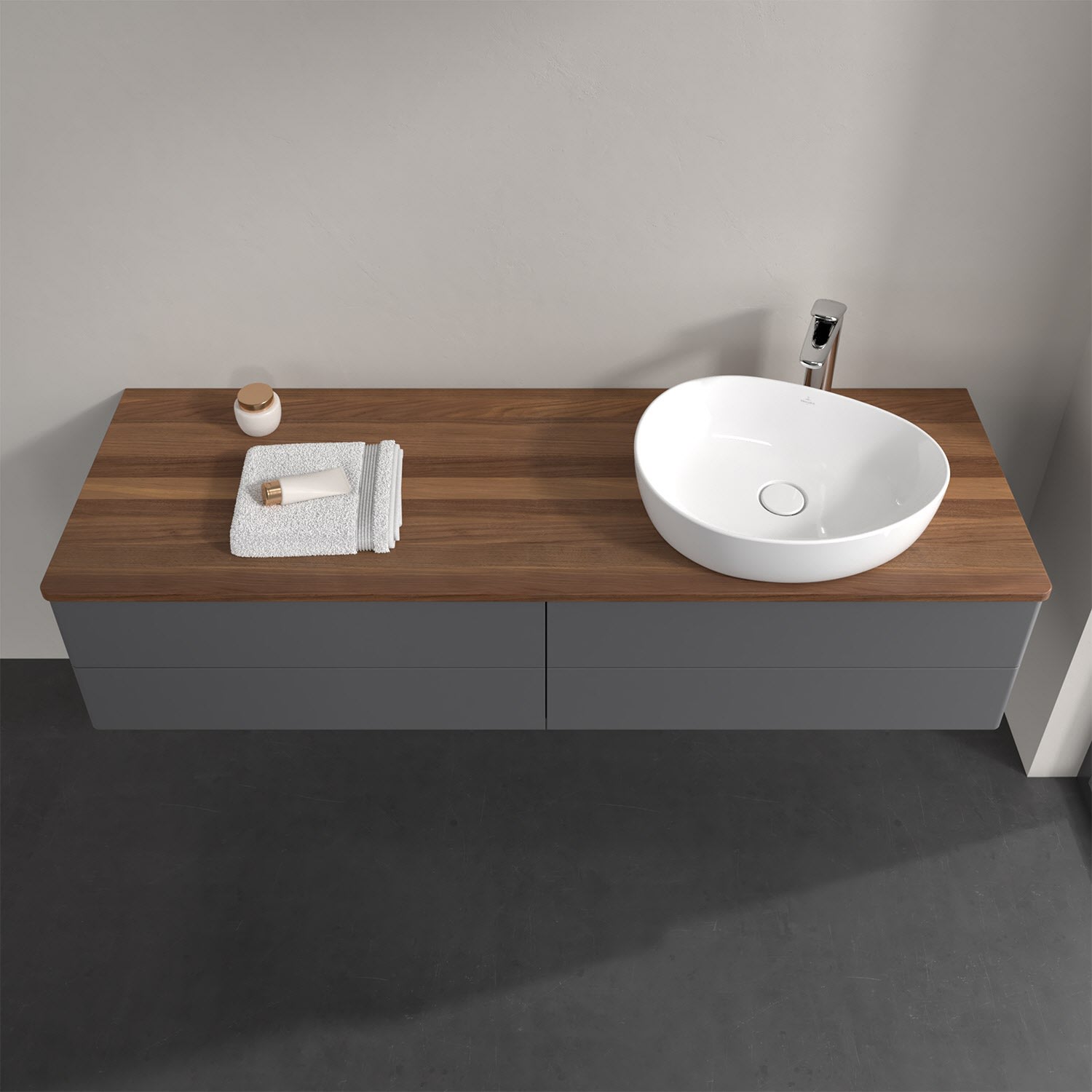 Für diesen Waschbeckenunterschrank stehen Ihnen Aufsatzwaschtische aus verschiedenen Serien zur Verfügung (siehe "Passliste" unter Downloads). Ein ausgewähltes Beispiel finden Sie im Zubehör. Den Waschtisch bitte separat mitbestellen.