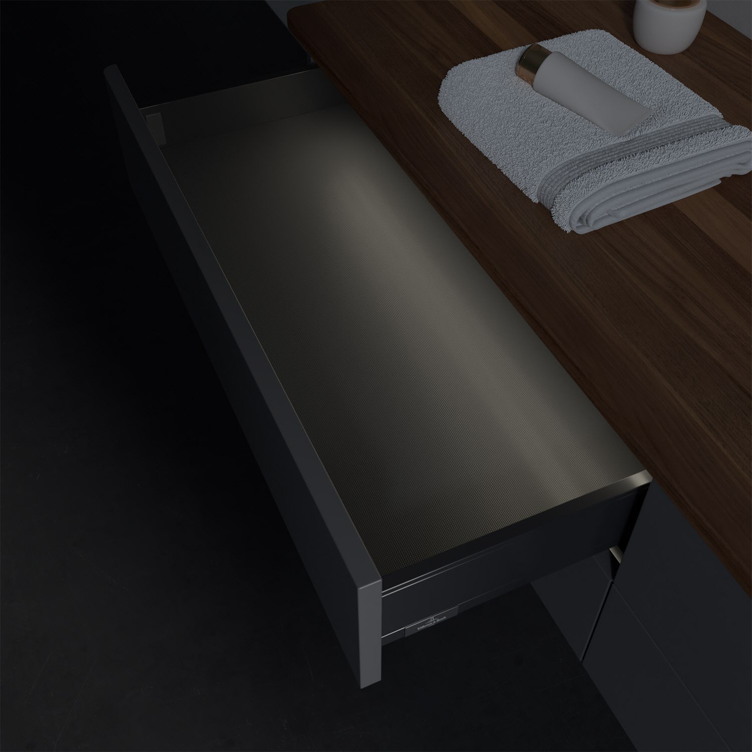 - in Schublade integrierte LED-Leiste mit warmweißem Licht zur Beleuchtung des Innenlebens