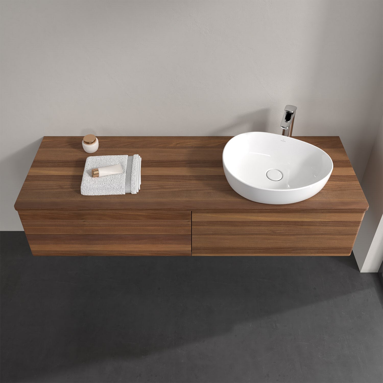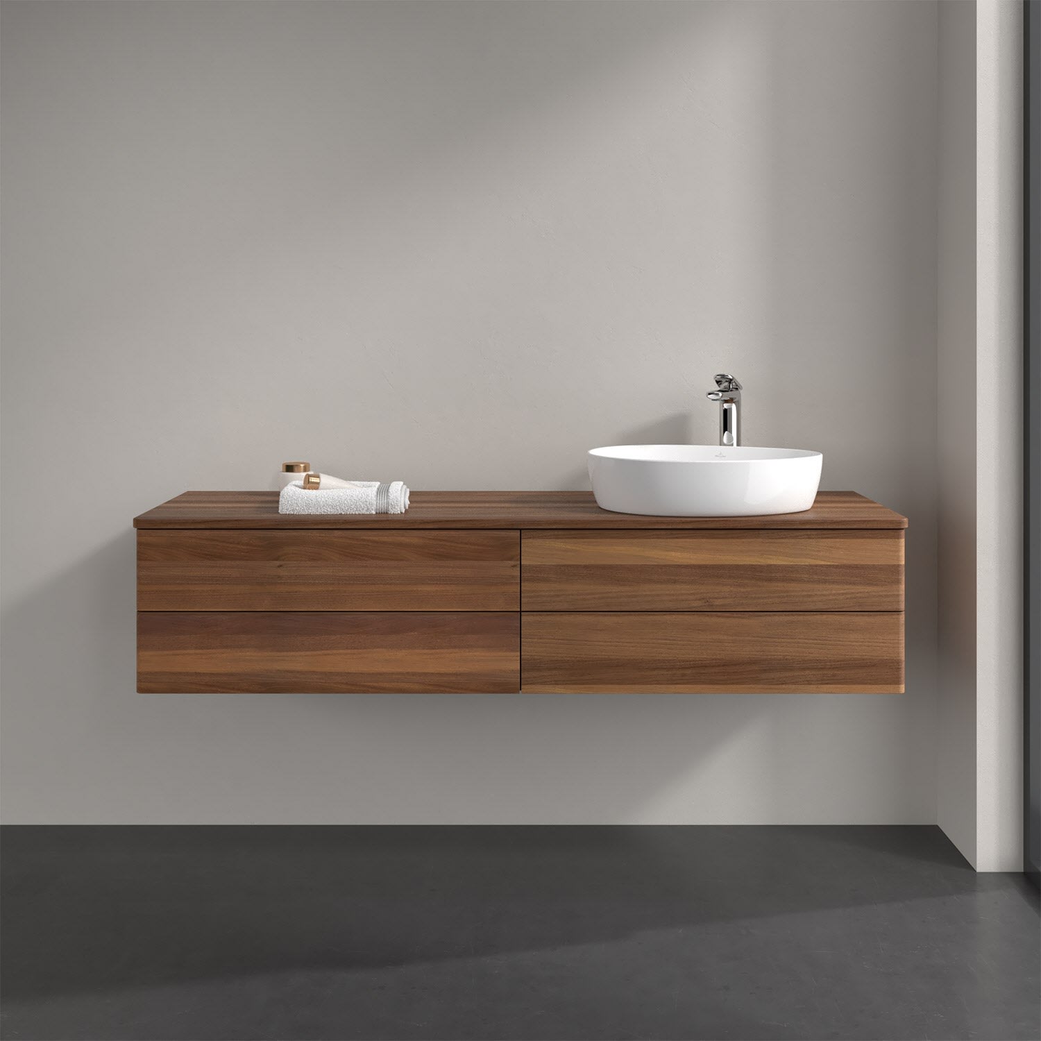 Der wandhängende Antao Waschtischunterschrank bietet mit seinen vier Auszügen und seiner erstaunlichen Größe viel Platz zum Verstauen von Utensilien im Badezimmer. Dank des seitlich platzierten Aufsatzwaschtischs gibt es daneben weiteren Platz für Handtücher, Seifenspender & Co. auf der Waschtischplatte. Inspiriert von der Natur überzeugt der Unterschrank auch optisch mit sanfter Formsprache und abgerundete Kanten. Die grifflosen Auszüge sind mit der Push-to-Open Funktion ausgestattet und verfügen über einen Antirutschboden, damit Utensilien sicher verstaut werden können. Den Überblick behält man dank der warmweißen Auszugsbeleuchtung, die sich automatisch beim Öffnen einschaltet. Mit seiner Vollauszug- und Selbsteinzug-Funktion ist der Schrank praktisch und leicht zu bedienen. Qualität von Villeroy & Boch! Für eine besonders leichte Pflege sorgt die mehrschichtig deckend lackierte Oberfläche. Bei der Ausführung in Massivholz wird dank des verarbeiteten Massivholzes jedes Möbel zu einem Unikat, das sich durch das lebendige Naturmaterial durch seine einzigartige Struktur und Maserung auszeichnet.
