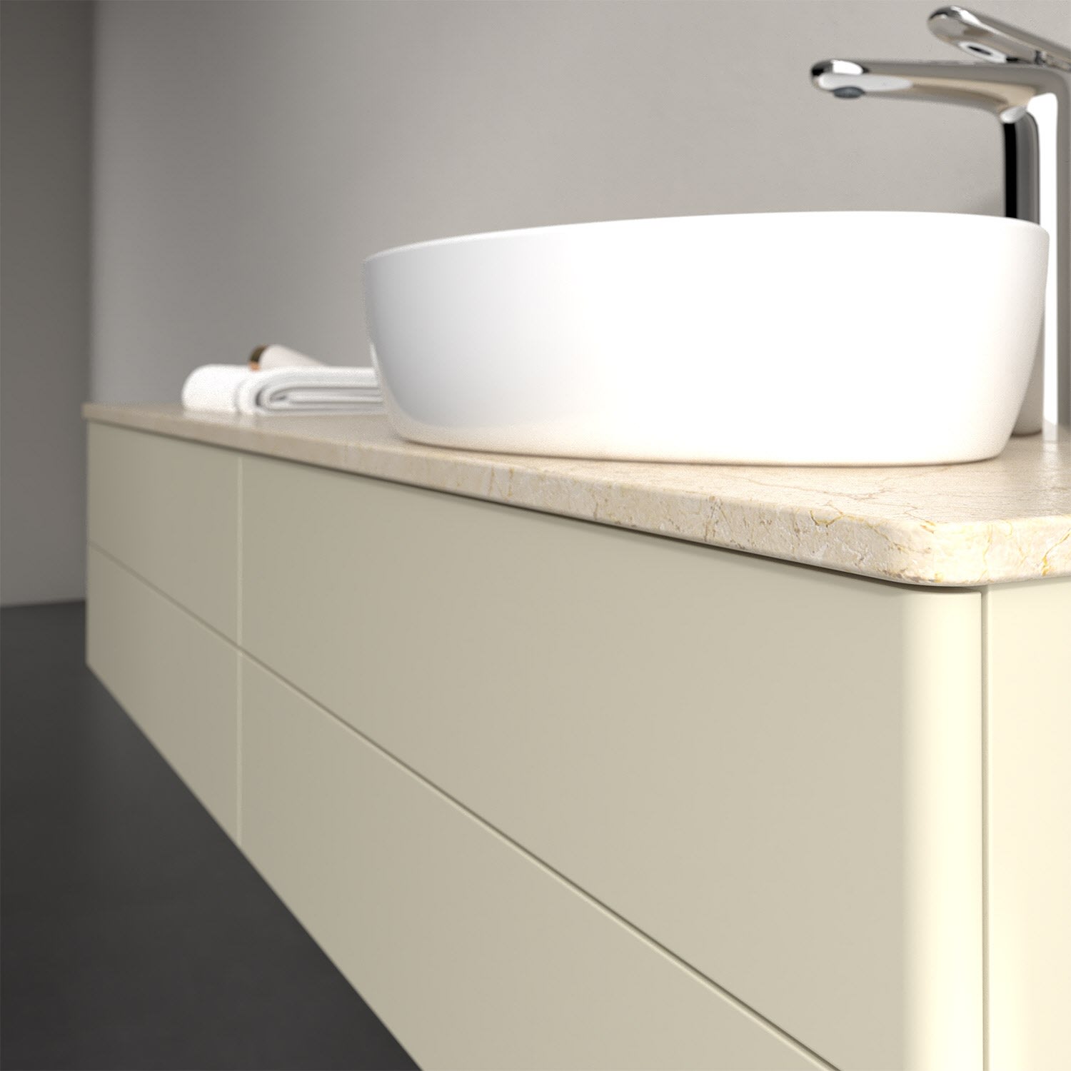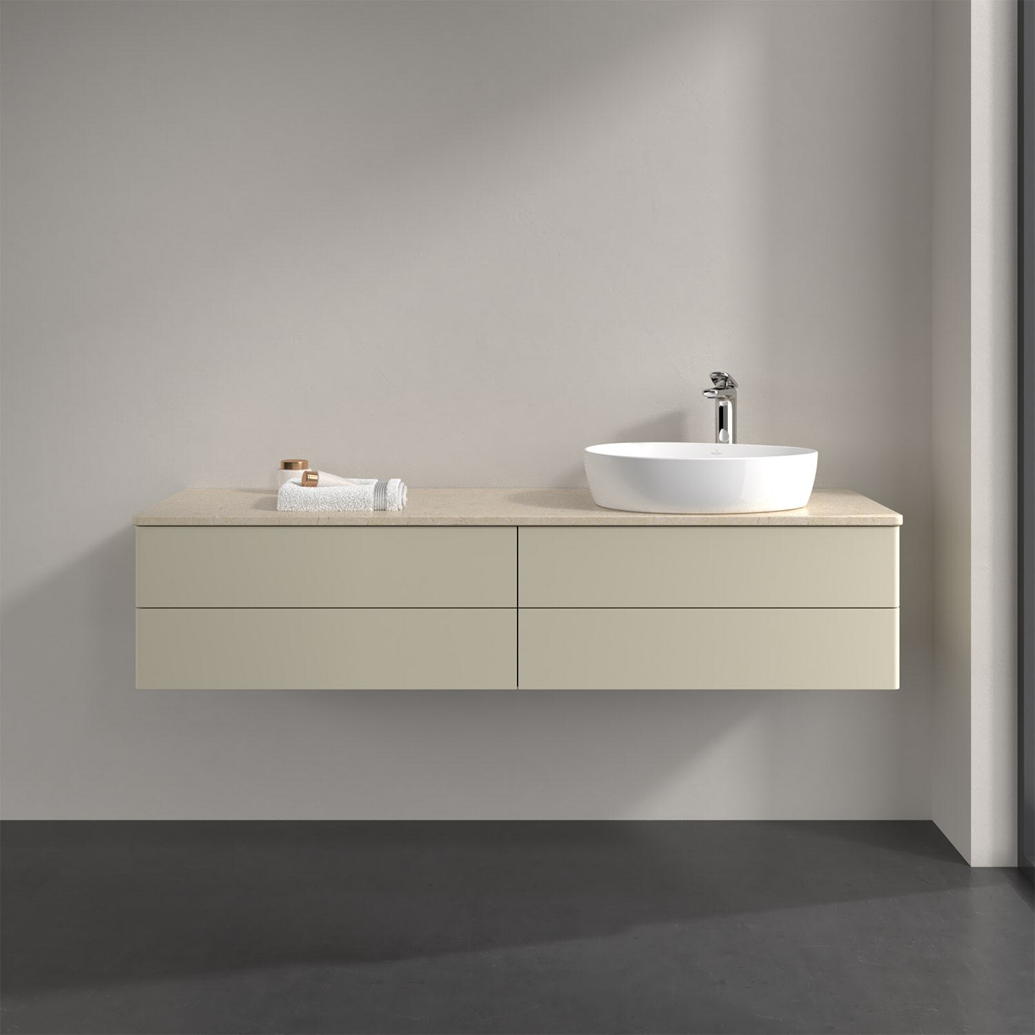 Für diesen Waschbeckenunterschrank stehen Ihnen Aufsatzwaschtische aus verschiedenen Serien zur Verfügung (siehe "Passliste" unter Downloads). Ein ausgewähltes Beispiel finden Sie im Zubehör. Den Waschtisch bitte separat mitbestellen.
