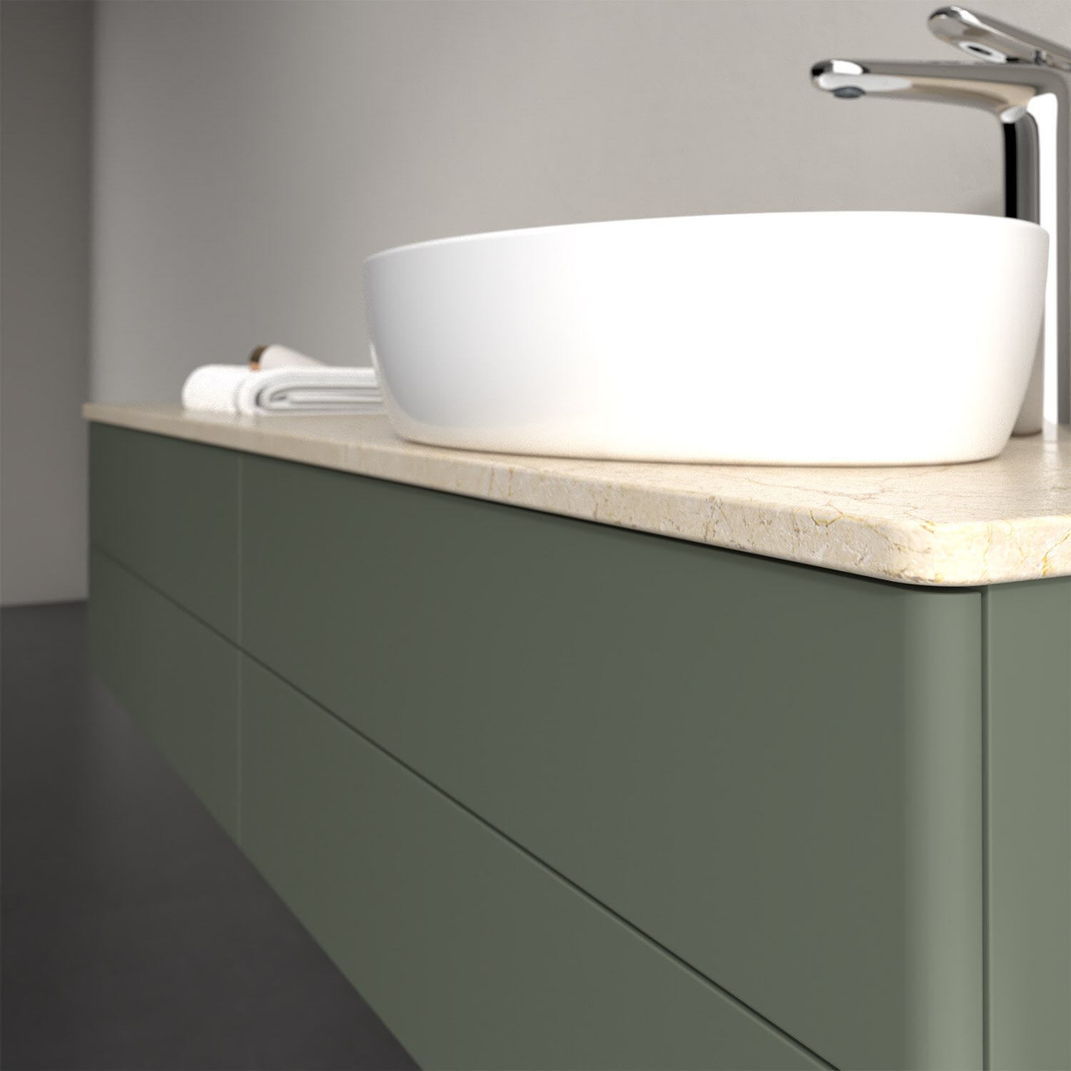 Der wandhängende Antao Waschtischunterschrank bietet mit seinen vier Auszügen und seiner erstaunlichen Größe viel Platz zum Verstauen von Utensilien im Badezimmer. Dank des seitlich platzierten Aufsatzwaschtischs gibt es daneben weiteren Platz für Handtücher, Seifenspender & Co. auf der Waschtischplatte. Inspiriert von der Natur überzeugt der Unterschrank auch optisch mit sanfter Formsprache und abgerundete Kanten. Die grifflosen Auszüge sind mit der Push-to-Open Funktion ausgestattet und verfügen über einen Antirutschboden, damit Utensilien sicher verstaut werden können. Den Überblick behält man dank der warmweißen Auszugsbeleuchtung, die sich automatisch beim Öffnen einschaltet. Mit seiner Vollauszug- und Selbsteinzug-Funktion ist der Schrank praktisch und leicht zu bedienen. Qualität von Villeroy & Boch! Für eine besonders leichte Pflege sorgt die mehrschichtig deckend lackierte Oberfläche. Bei der Ausführung in Massivholz wird dank des verarbeiteten Massivholzes jedes Möbel zu einem Unikat, das sich durch das lebendige Naturmaterial durch seine einzigartige Struktur und Maserung auszeichnet.